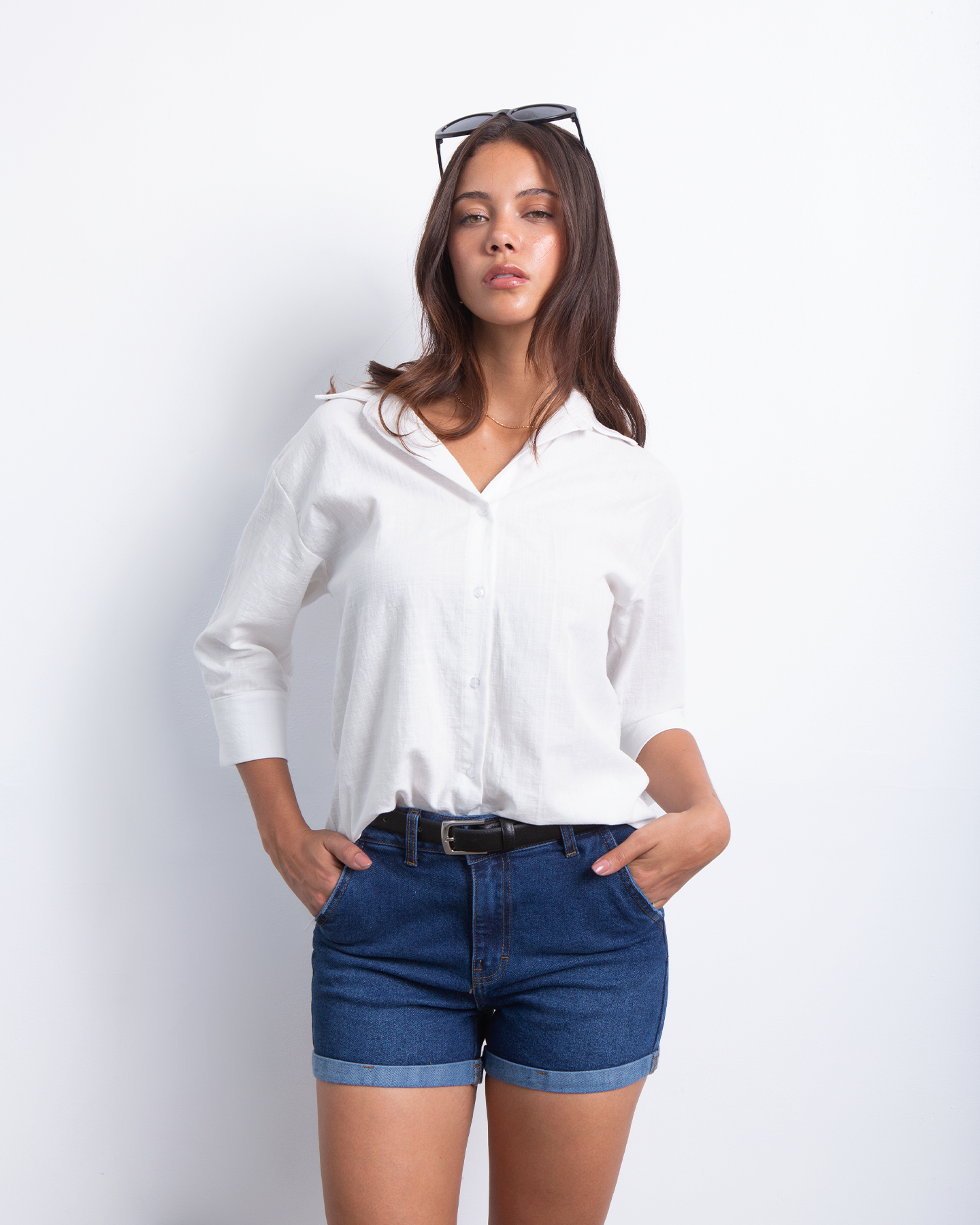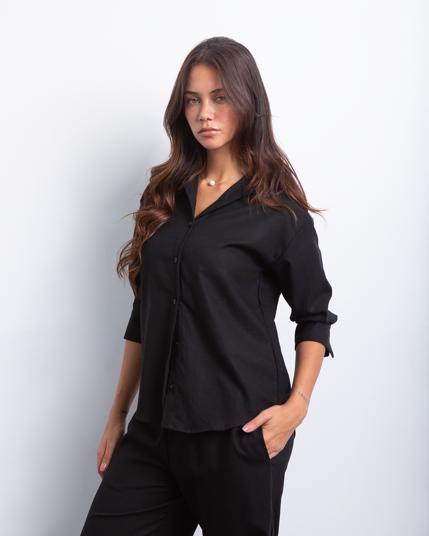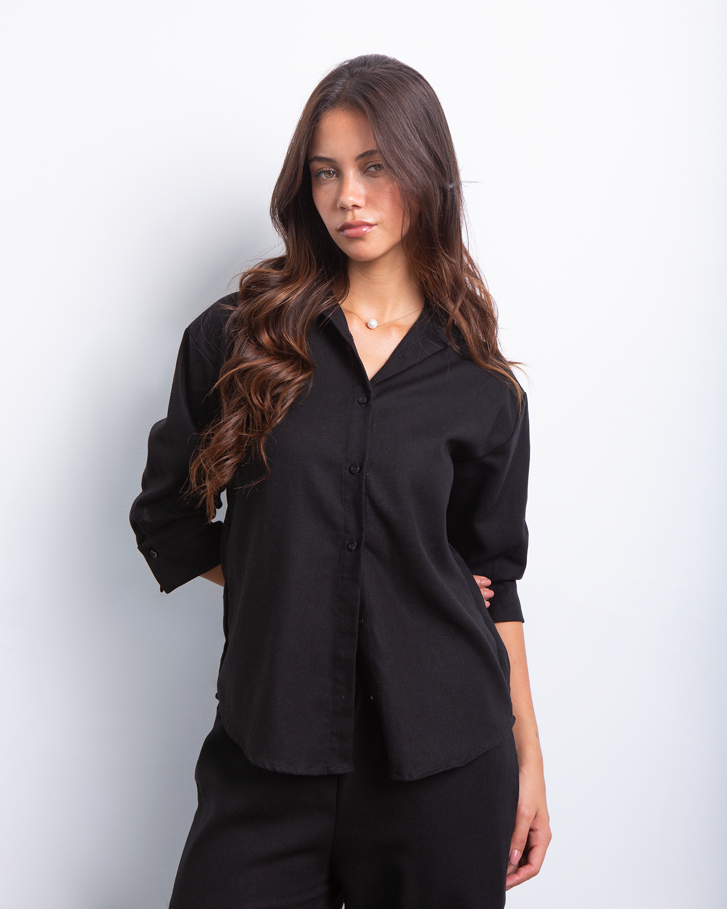 La Camisa Camila es esa prenda fácil de llevar que transforma cualquier look con su caída liviana y su corte relajado. Su diseño minimal con botones al frente y mangas 3/4 la hace ideal para usar tanto cerrada como abierta, creando capas con tops básicos. Perfecta para días cálidos, salidas casuales o looks de oficina con un twist relajado.