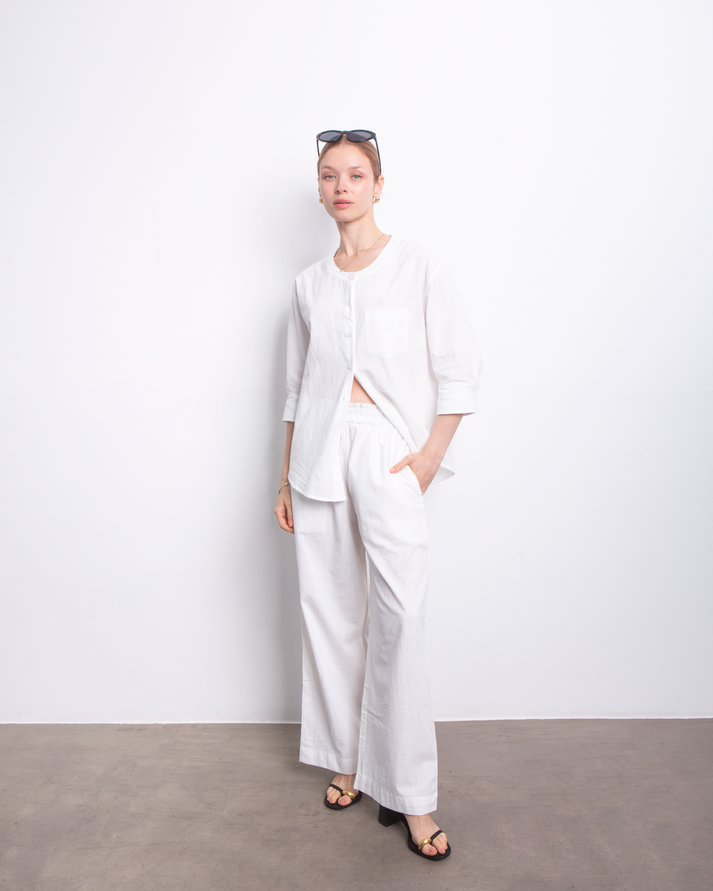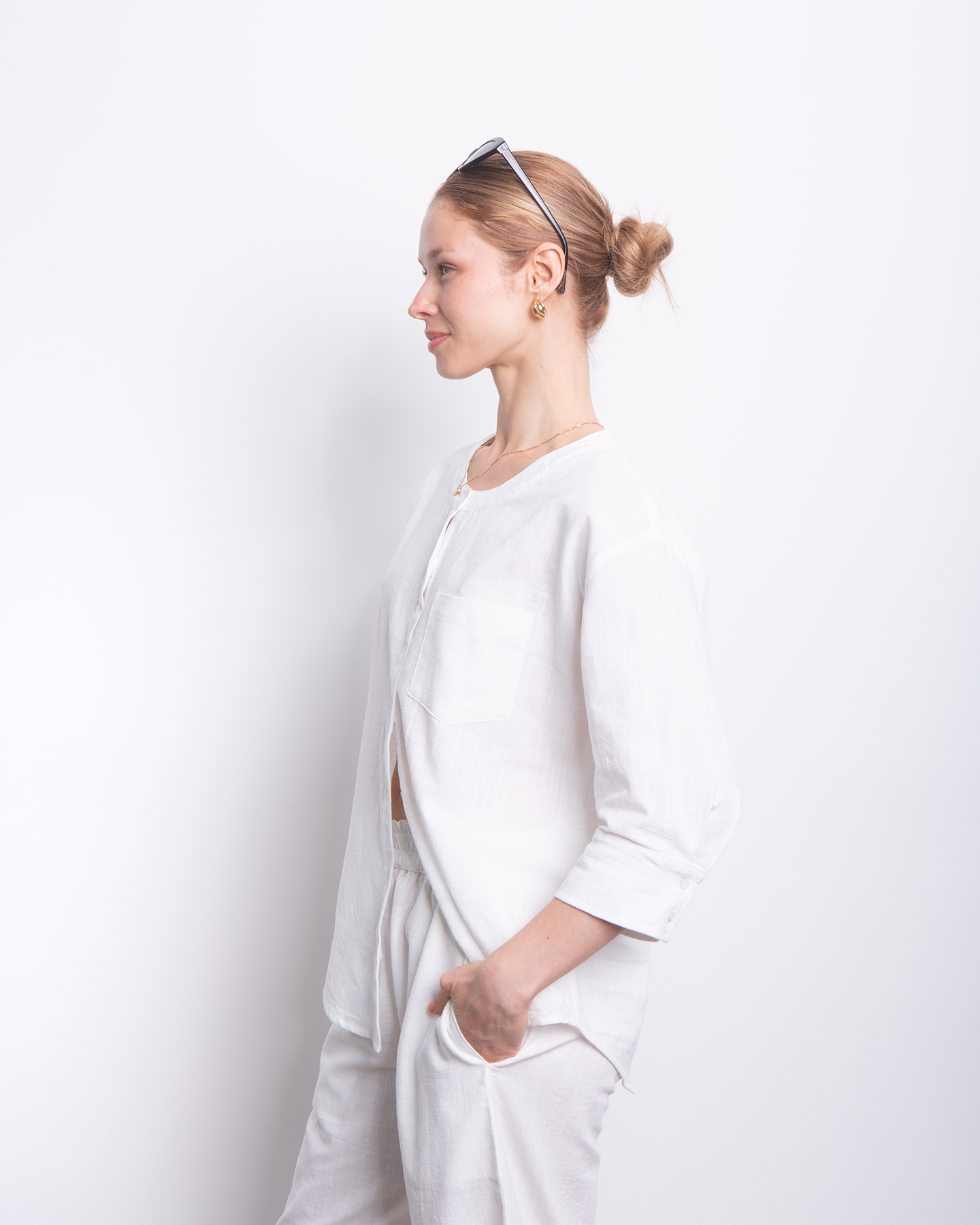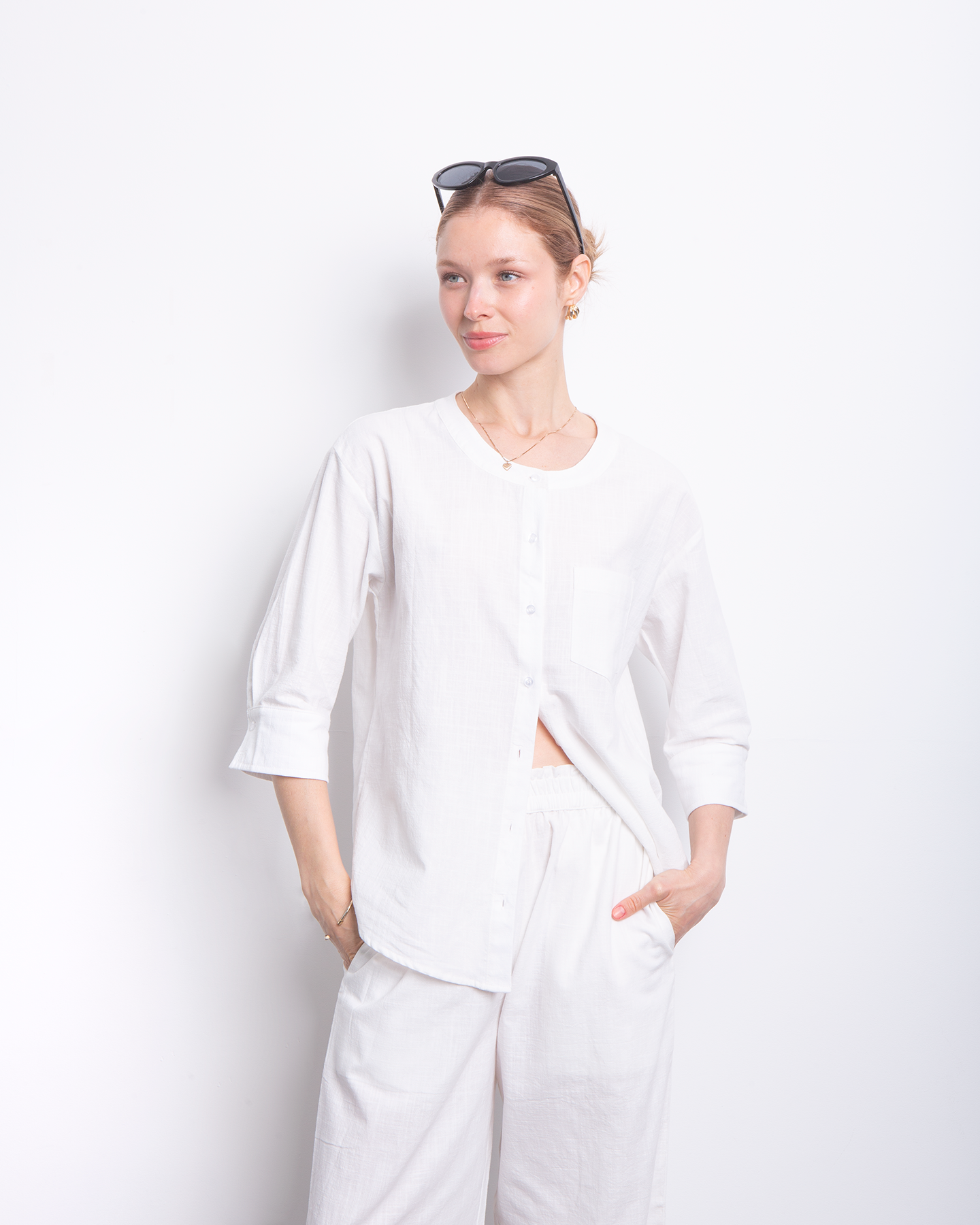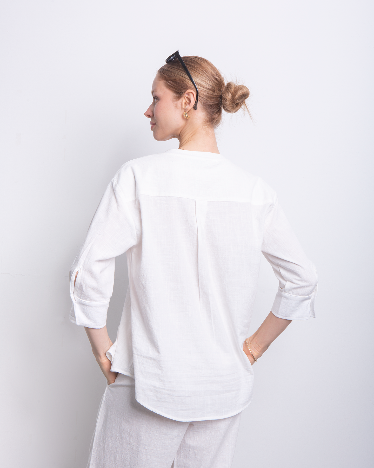 La camisa “Neru” tiene ese equilibrio entre lo casual y lo pulido. Su diseño con cuello mao, mangas 3/4 y botones al tono la hacen ideal para un look minimalista con actitud. Llévala suelta, abierta sobre un top o cerrada como blusa protagonista.