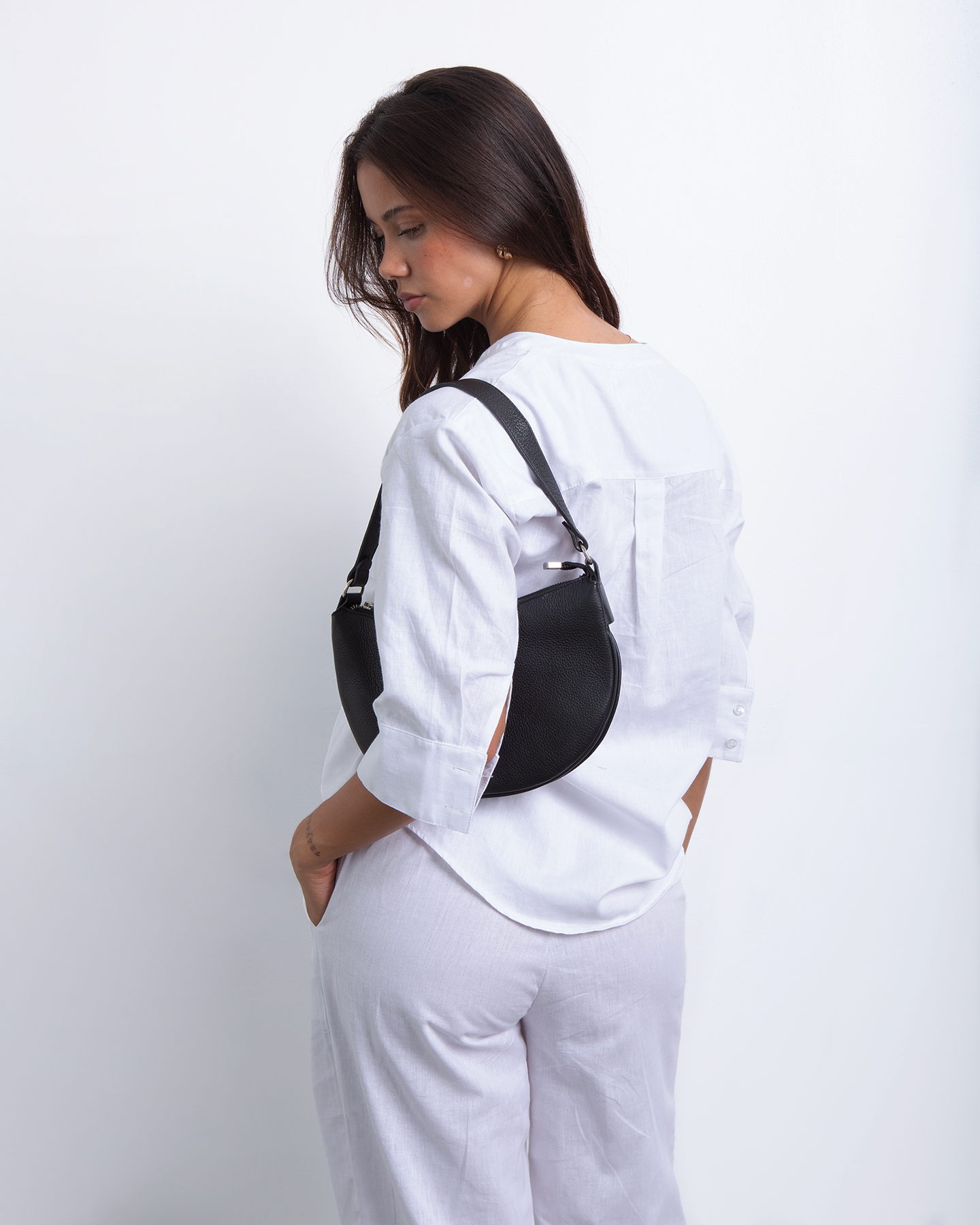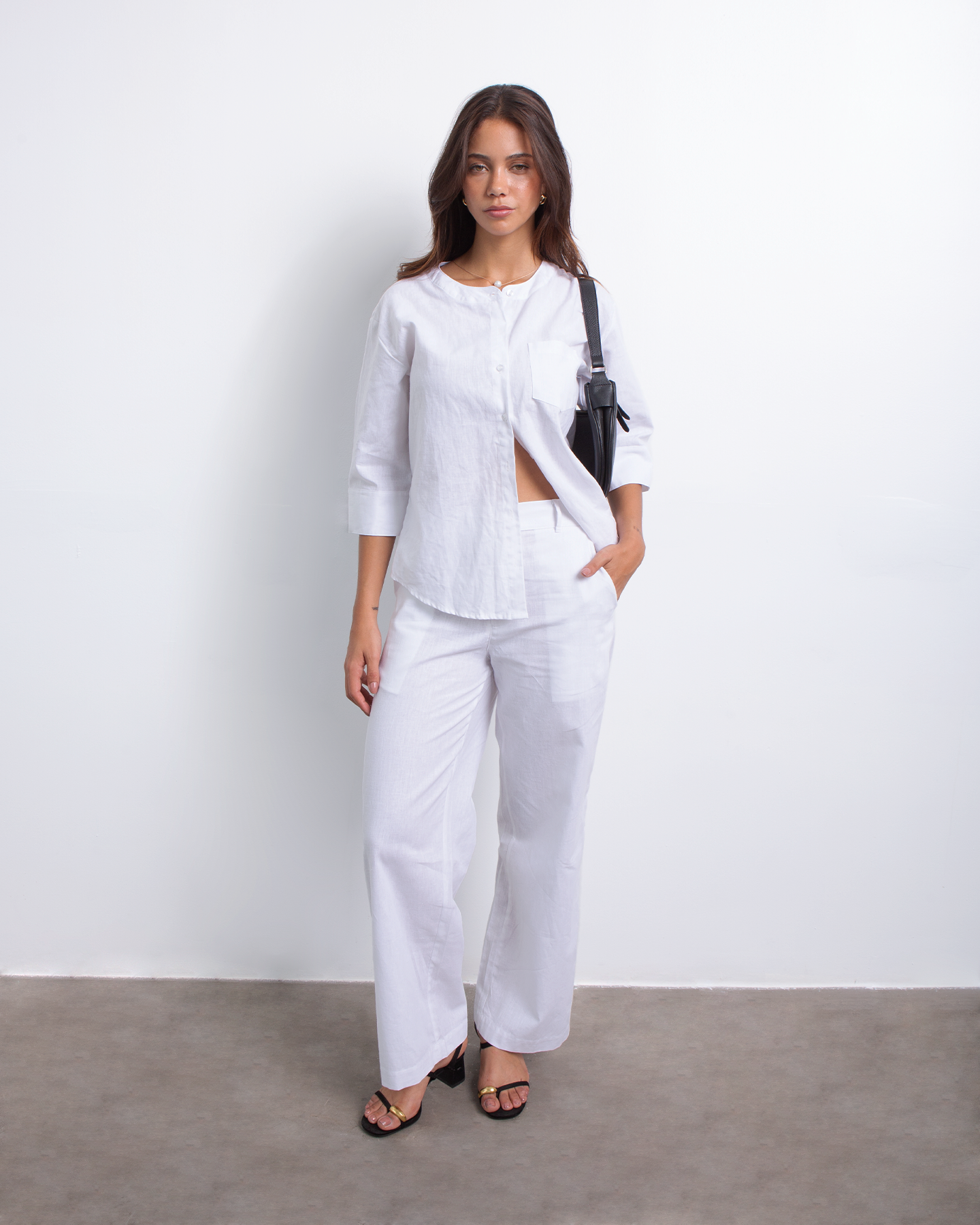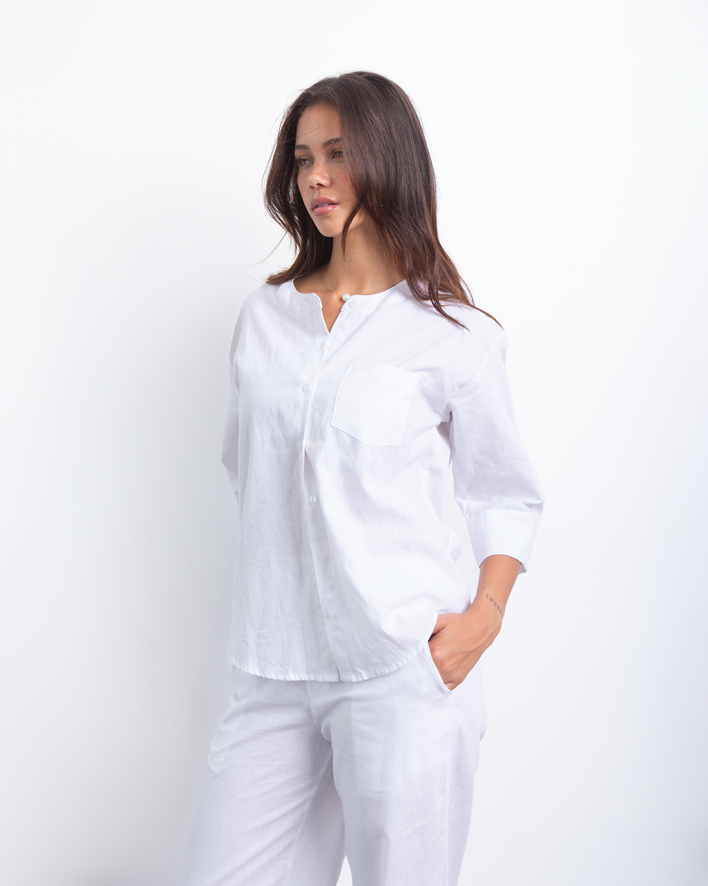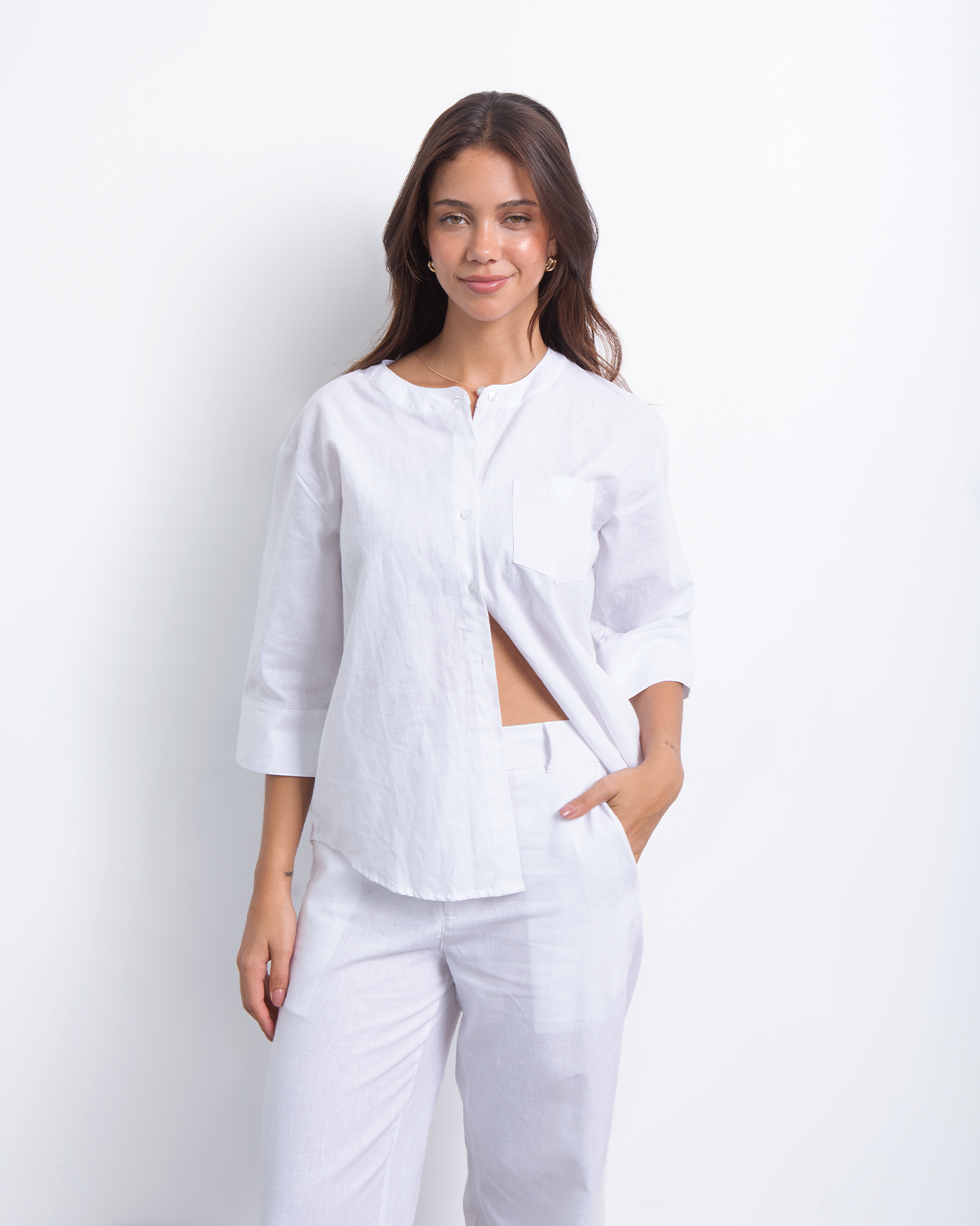 La camisa “Neru” tiene ese equilibrio entre lo casual y lo pulido. Su diseño con cuello mao, mangas 3/4 y botones al tono la hacen ideal para un look minimalista con actitud. Llévala suelta, abierta sobre un top o cerrada como blusa protagonista.