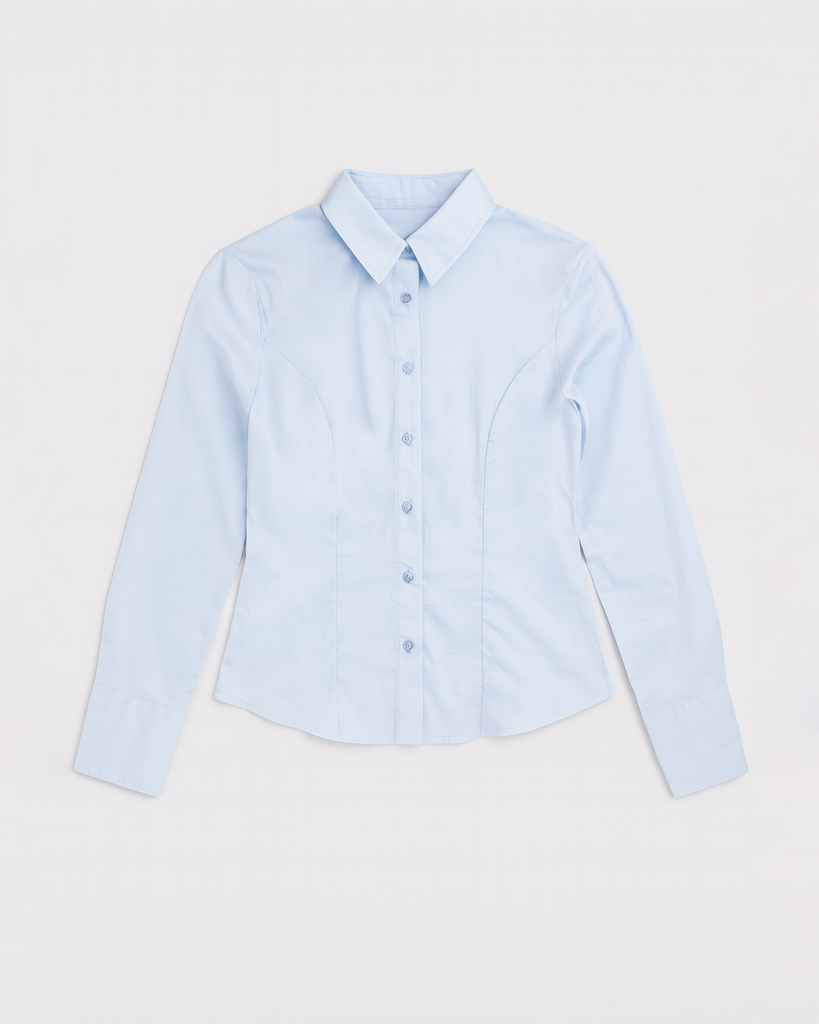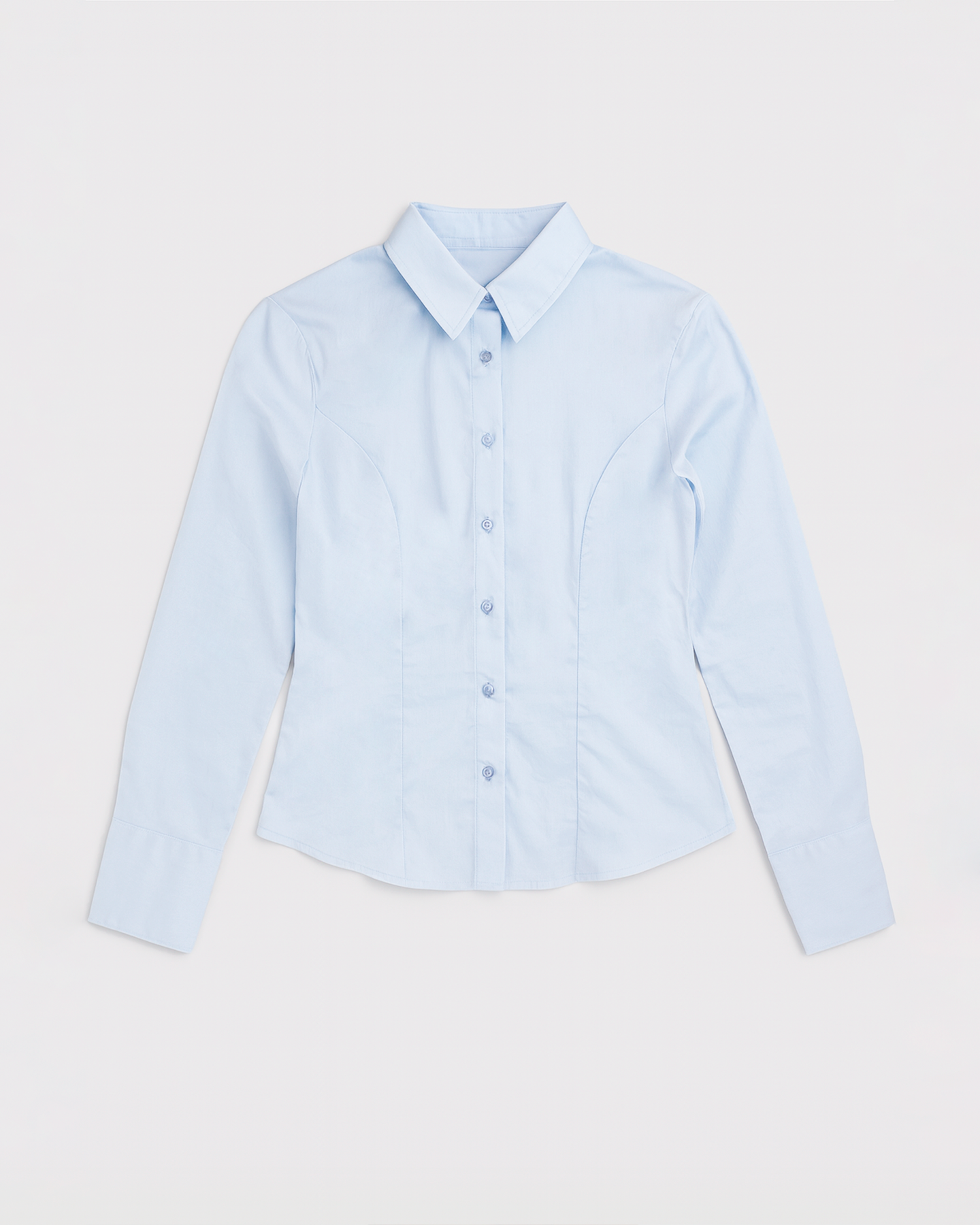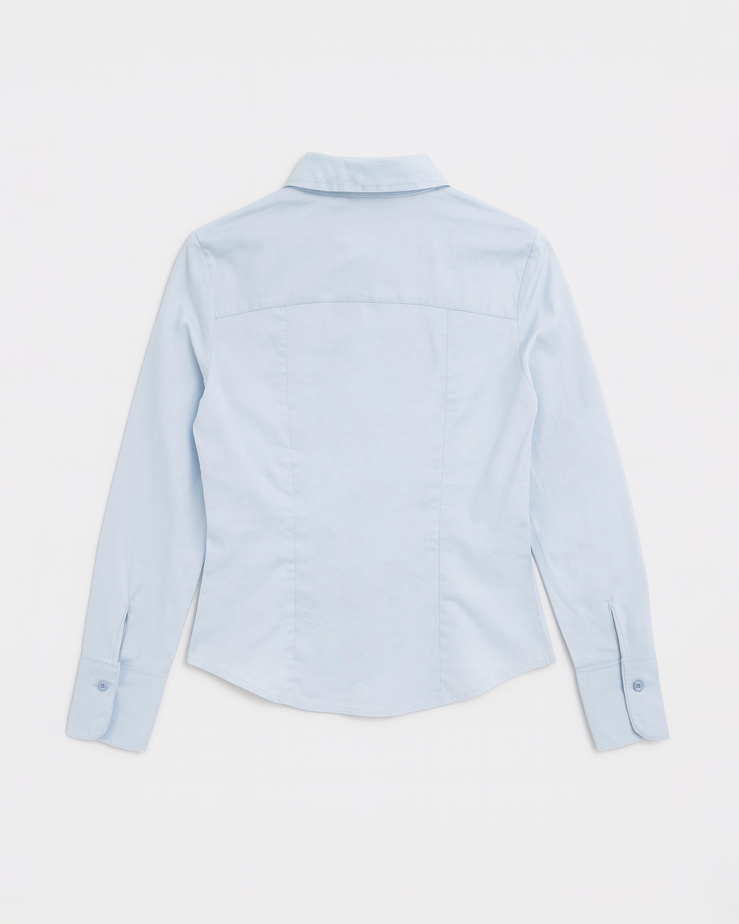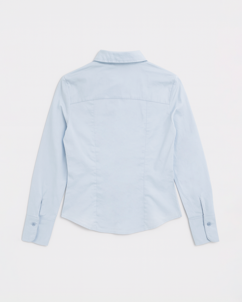 El cuello clásico y las costuras curvas en el frente aportan un aire pulido, mientras que el tono celeste claro suma frescura y versatilidad. Combínala con pantalones sastre para un look profesional o con jeans rectos para un outfit más relajado pero chic.
