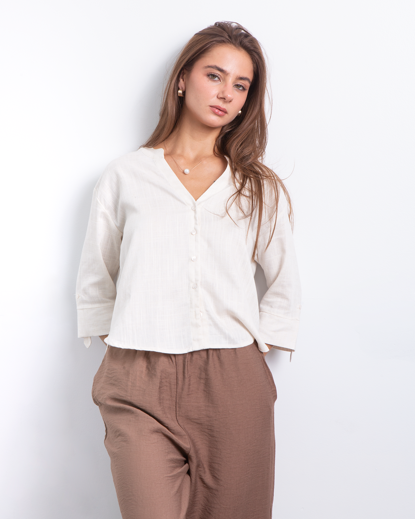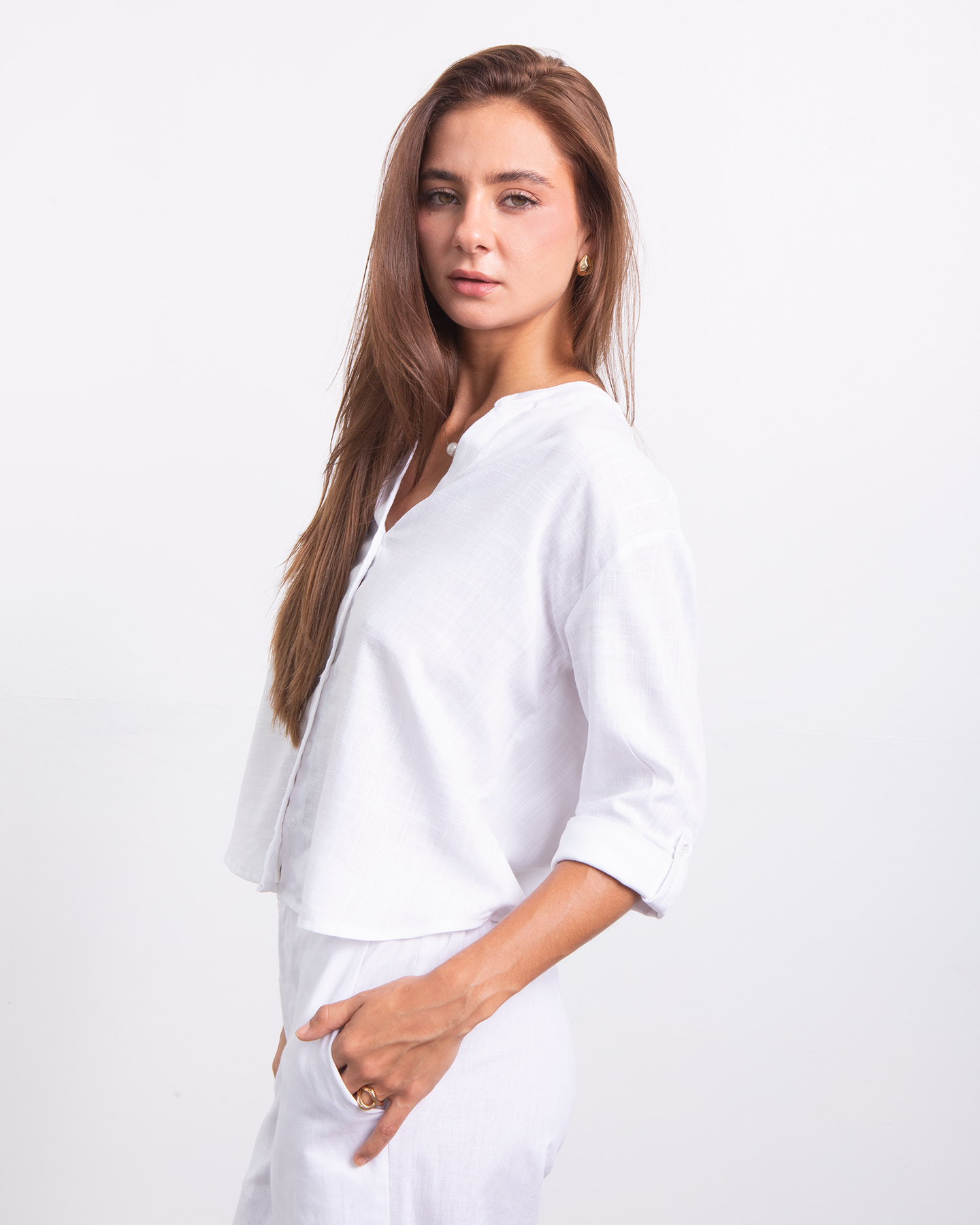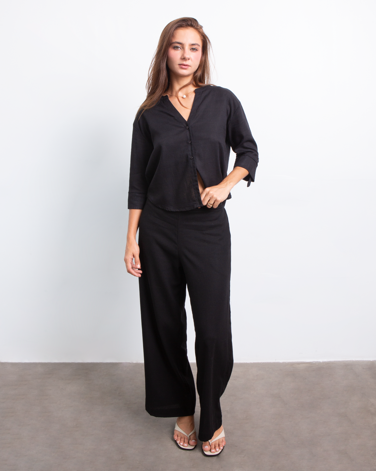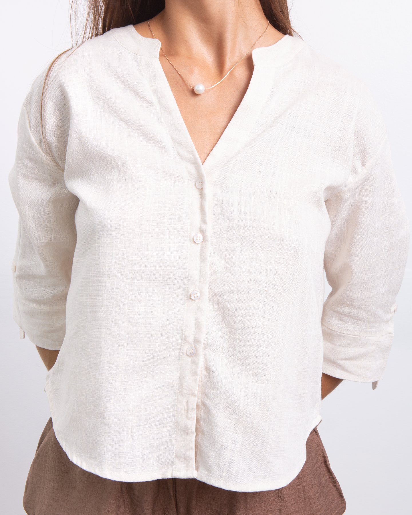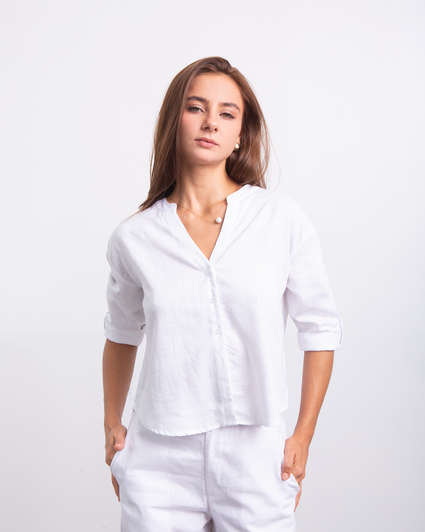 Minimalista, fresca y naturalmente elegante. Esta camisa estilo Neru combina la suavidad del rayon con la textura ligera del lino para crear una prenda versátil y atemporal. Su diseño limpio y femenino la convierte en ese básico especial que eleva cualquier look con facilidad. ✨