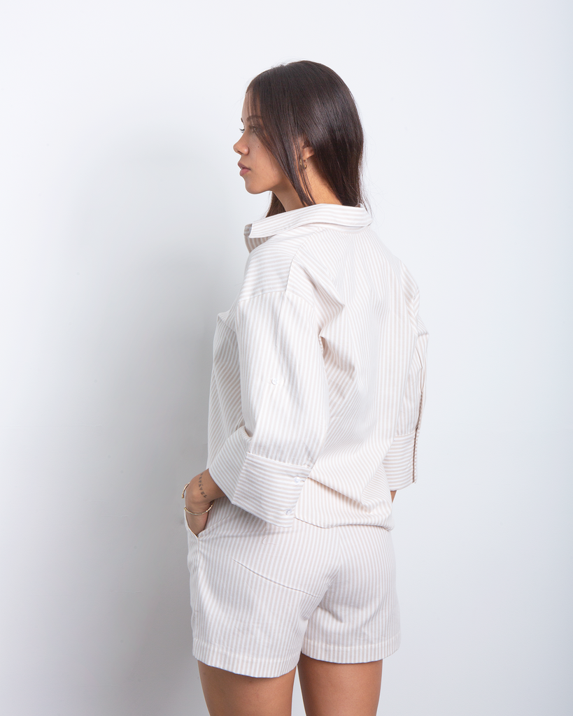 Ligera, fluida y con ese aire effortless que siempre suma. La camisa Abril de rayas beige es una prenda versátil que eleva cualquier look sin esfuerzo. Tiene un corte relajado, con caída suave y detalles que marcan la diferencia, como la pinza central y las mangas 3/4 con tira para ajustar.