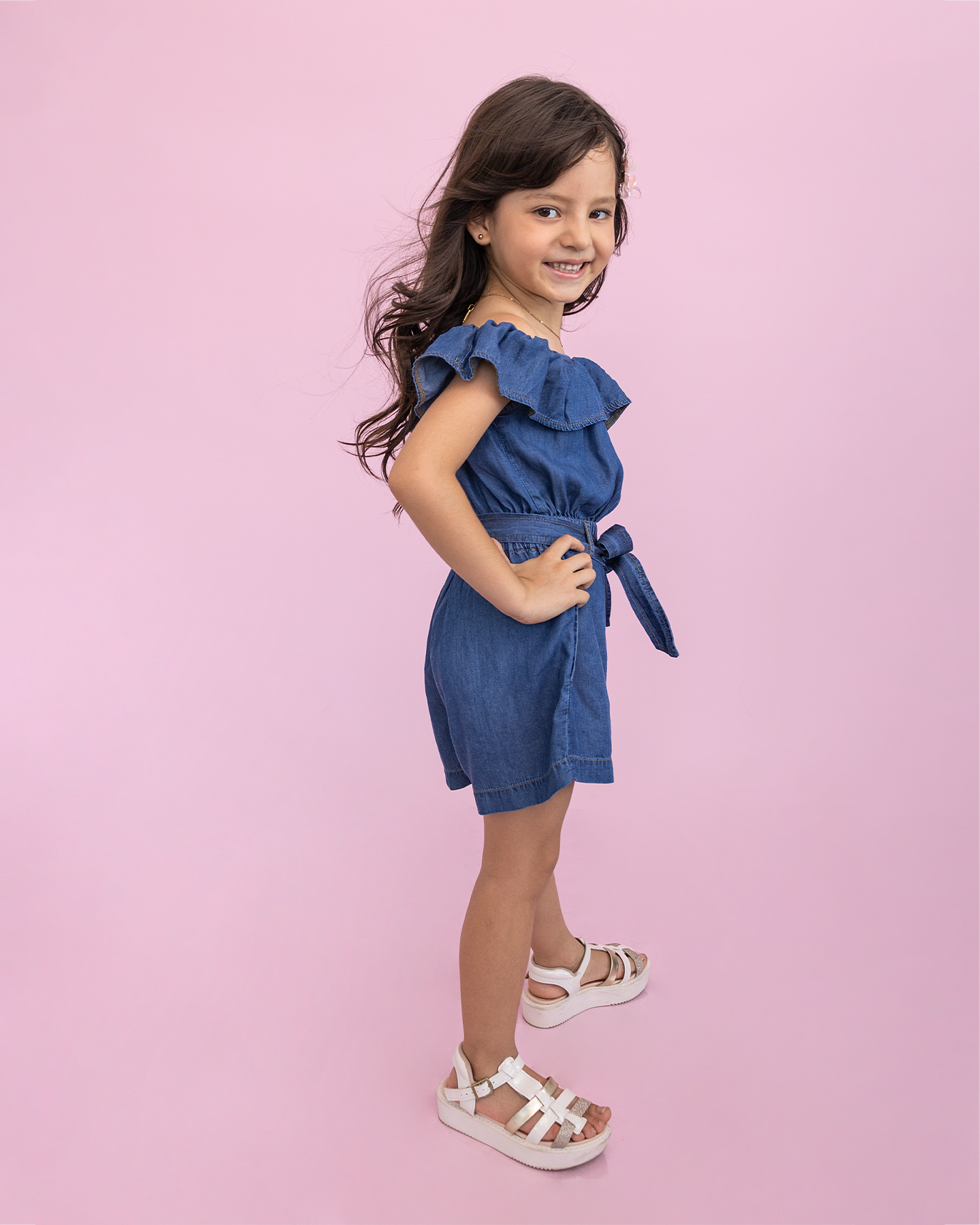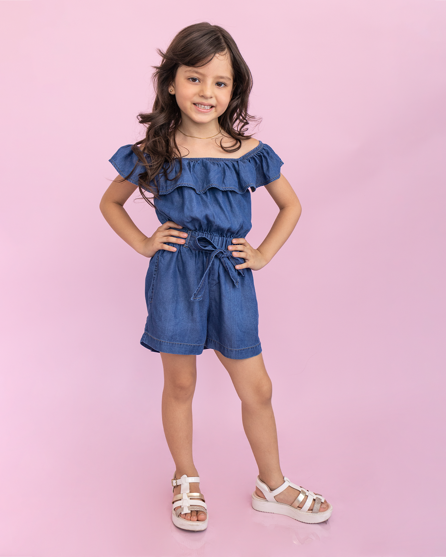 Nuestro Enterizo Maju es una opción divertida y cómoda para los días cálidos. Con estilo de short y un diseño de rumbera, este enterizo de denim presenta un detalle corrugado en la cintura con un cinto