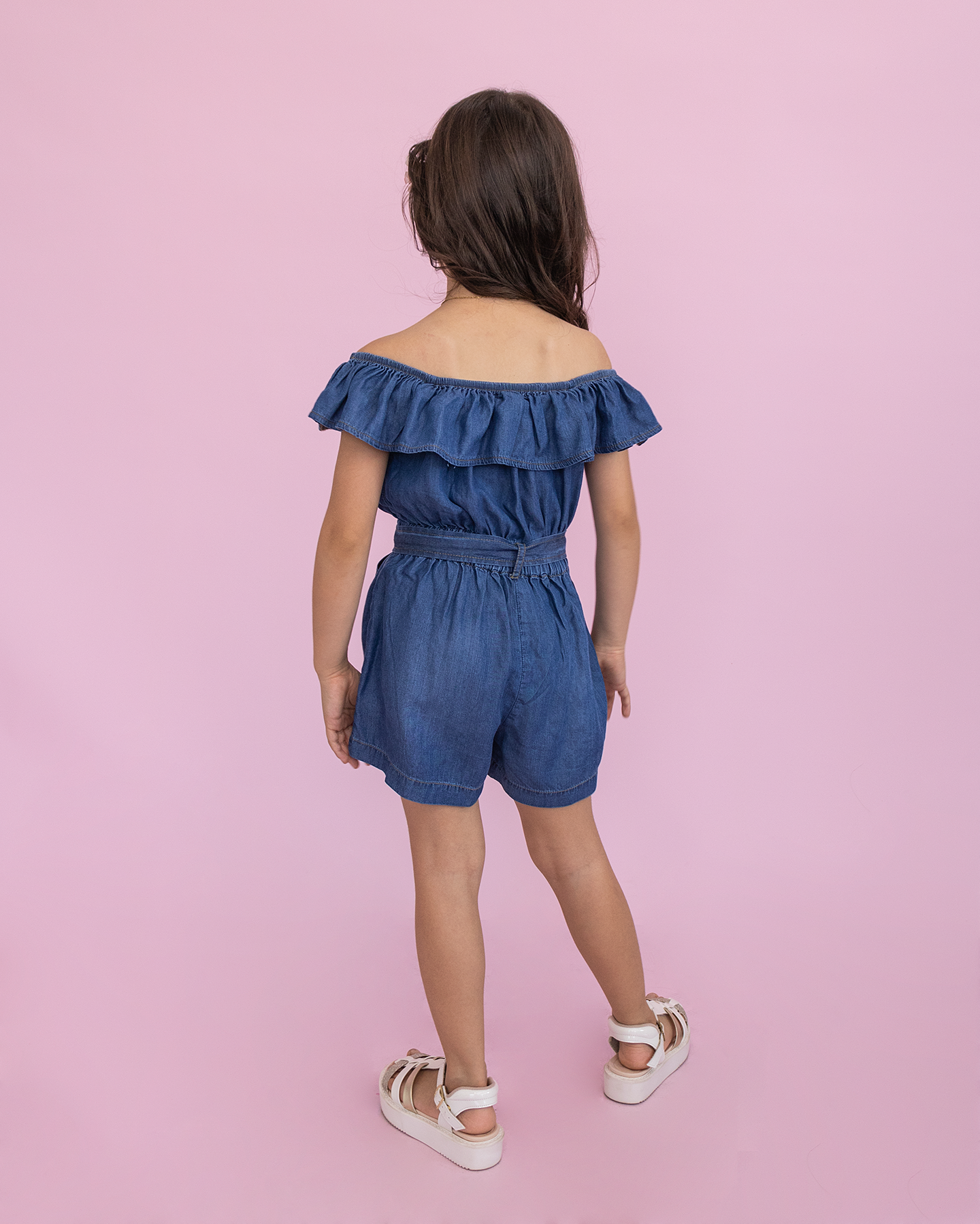 Enterizo de short de denim con cintura corrugada y hombros estilo rumbera