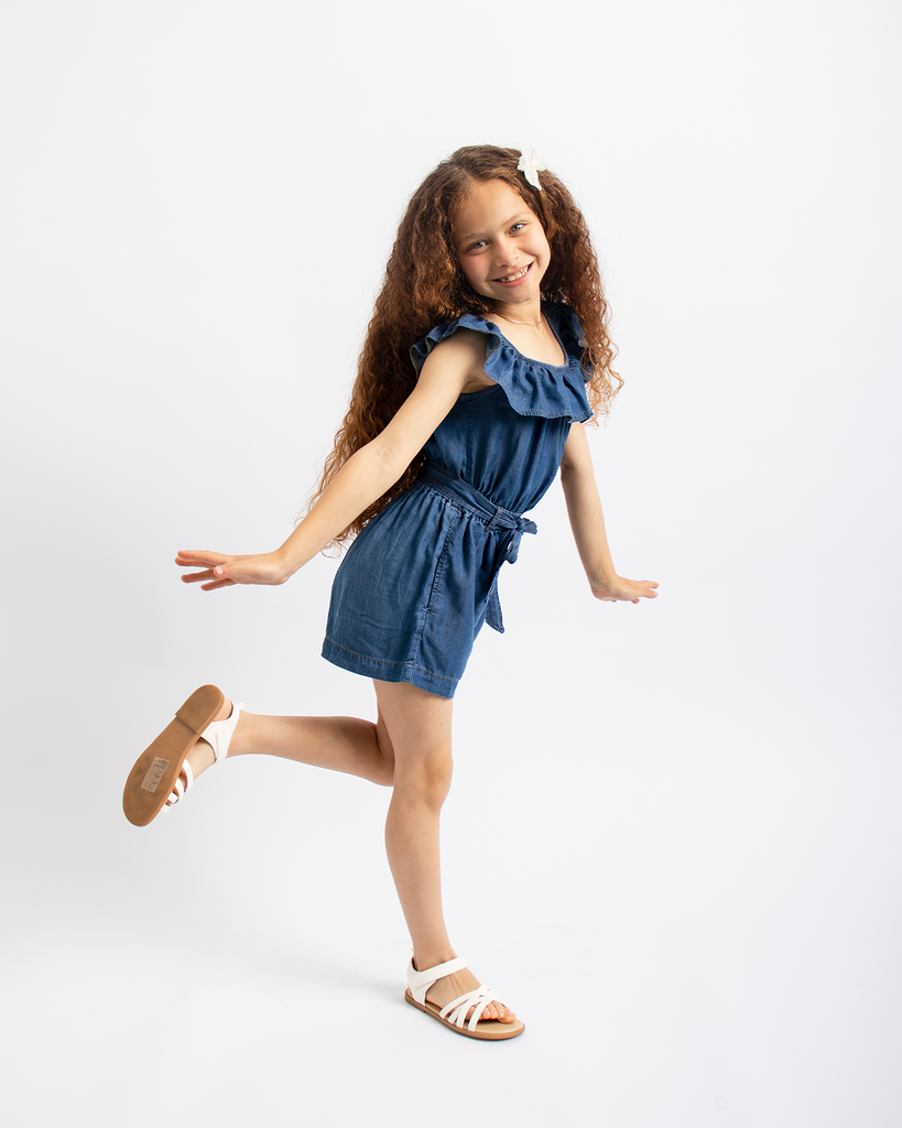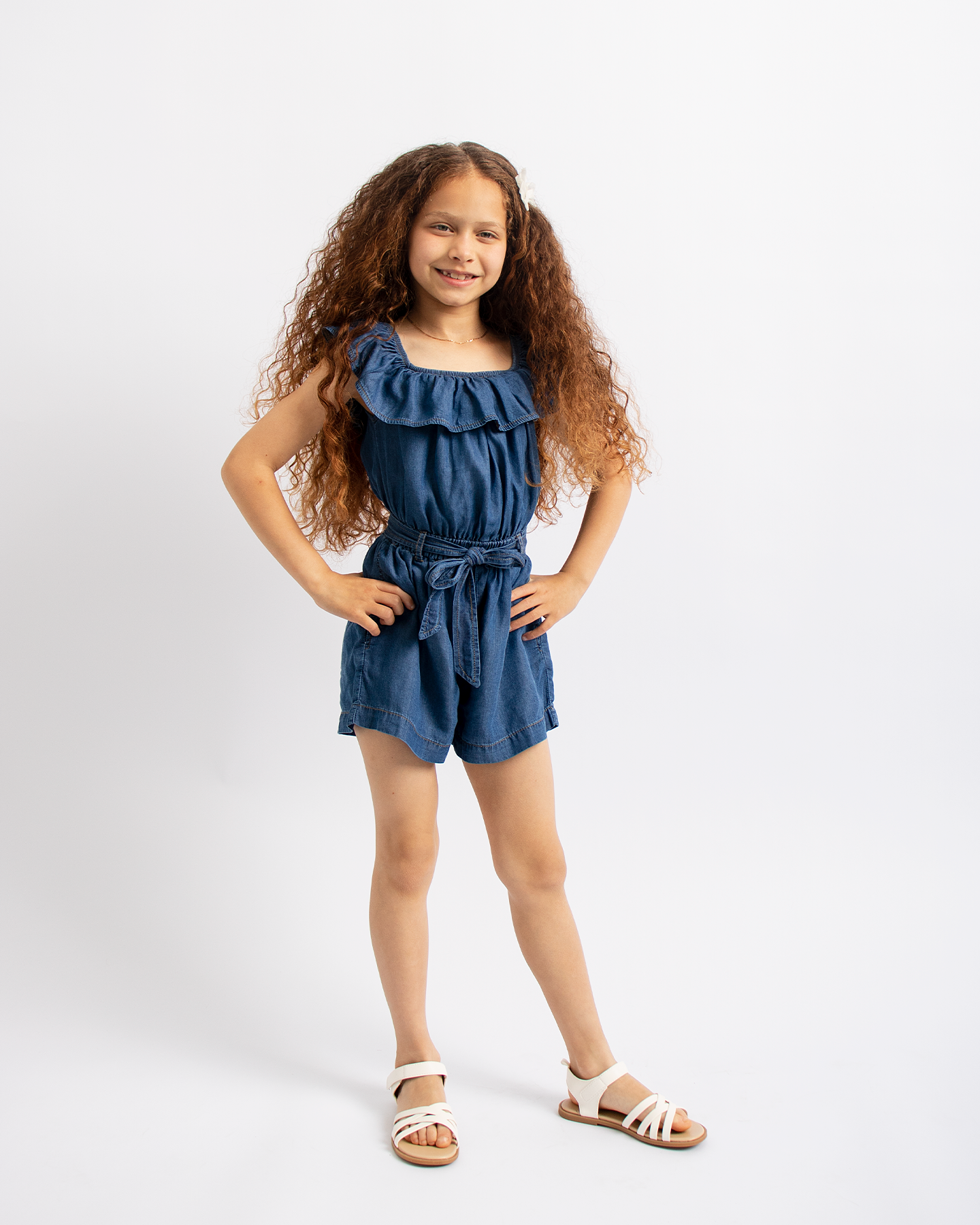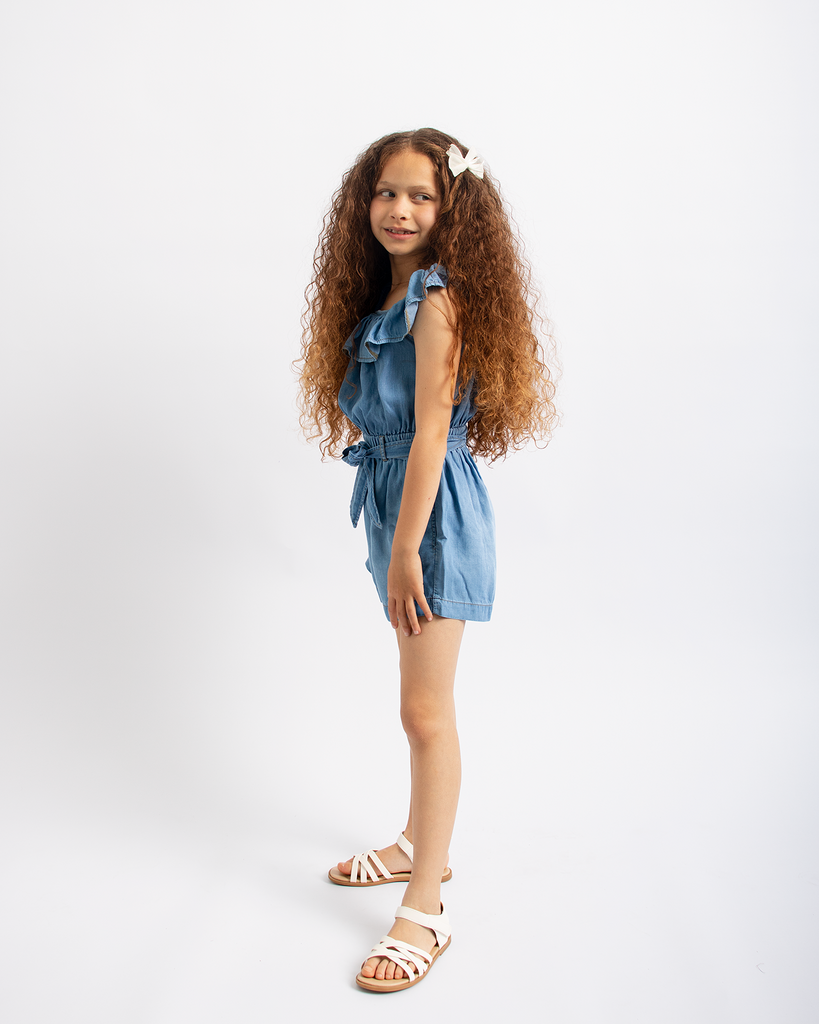 Nuestro Enterizo Maju es una opción divertida y cómoda para los días cálidos. Con estilo de short y un diseño de rumbera, este enterizo de denim presenta un detalle corrugado en la cintura con un cinto