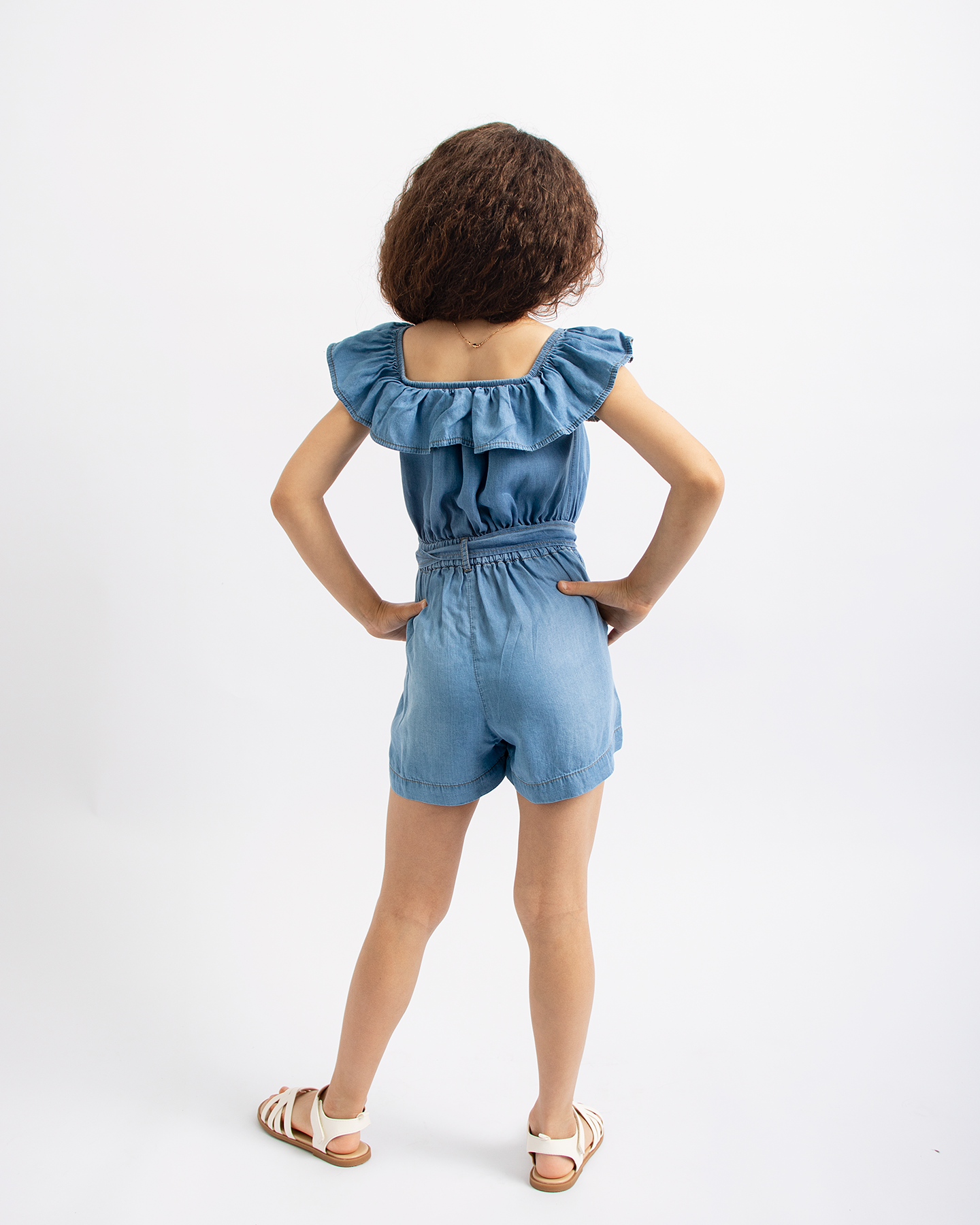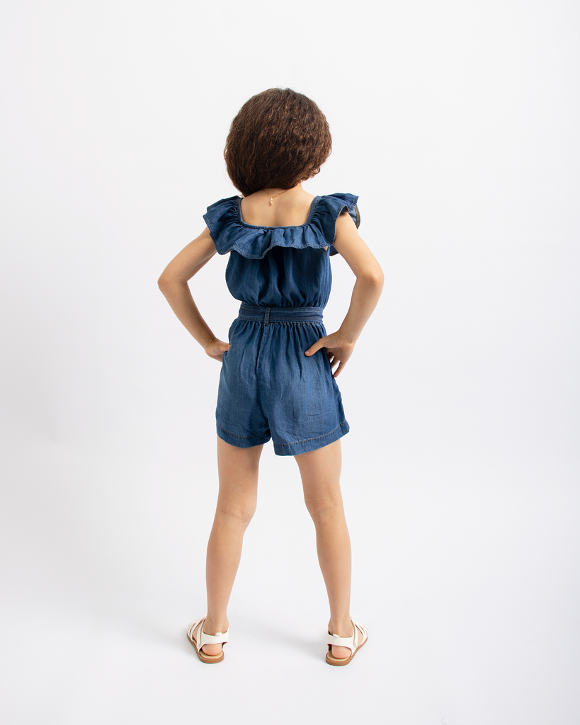 Enterizo de short de denim con cintura corrugada y hombros estilo rumbera