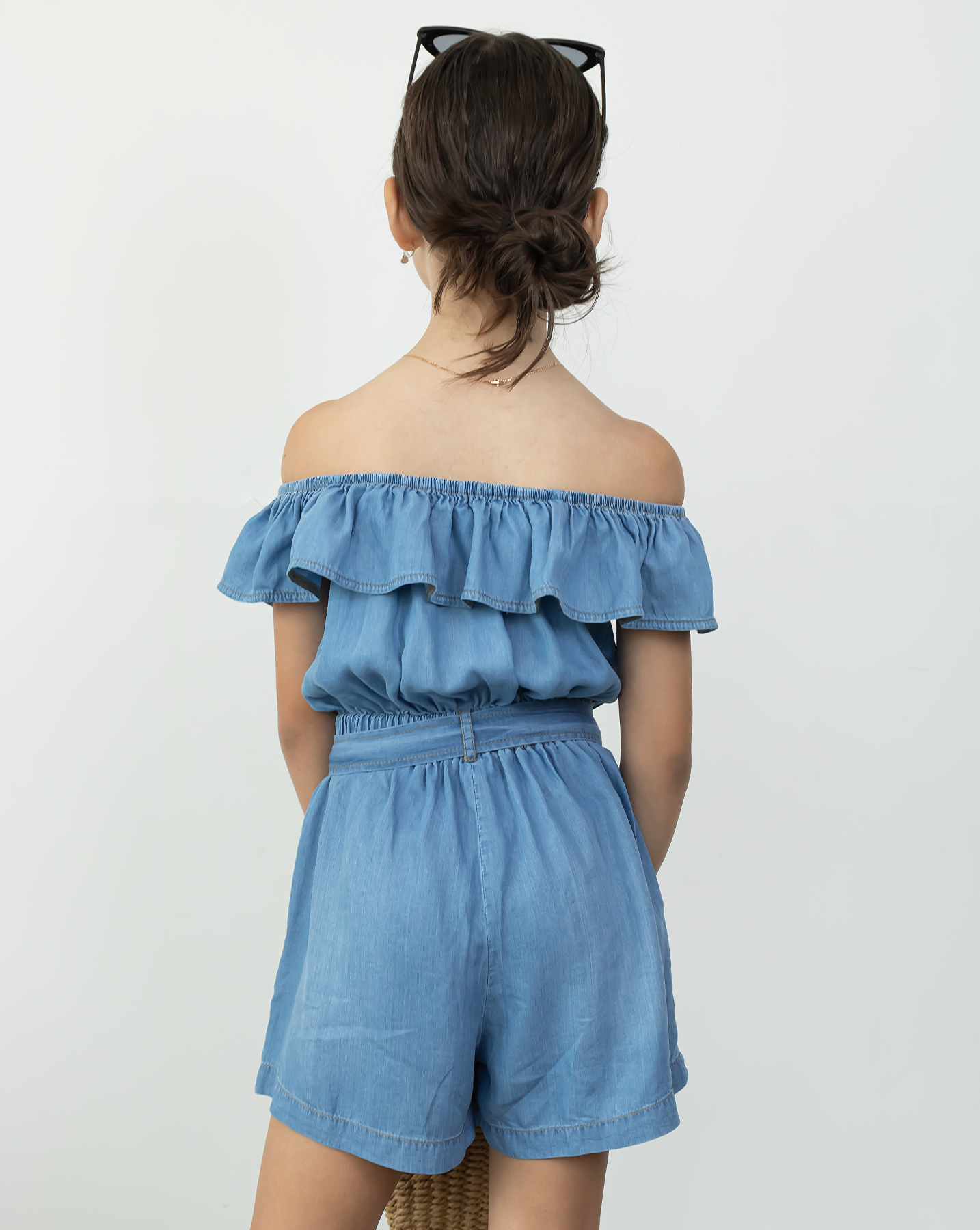 Enterizo de short de denim con cintura corrugada y hombros estilo rumbera