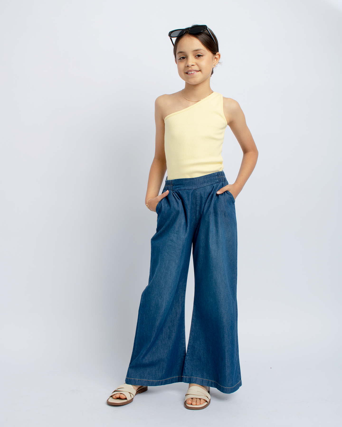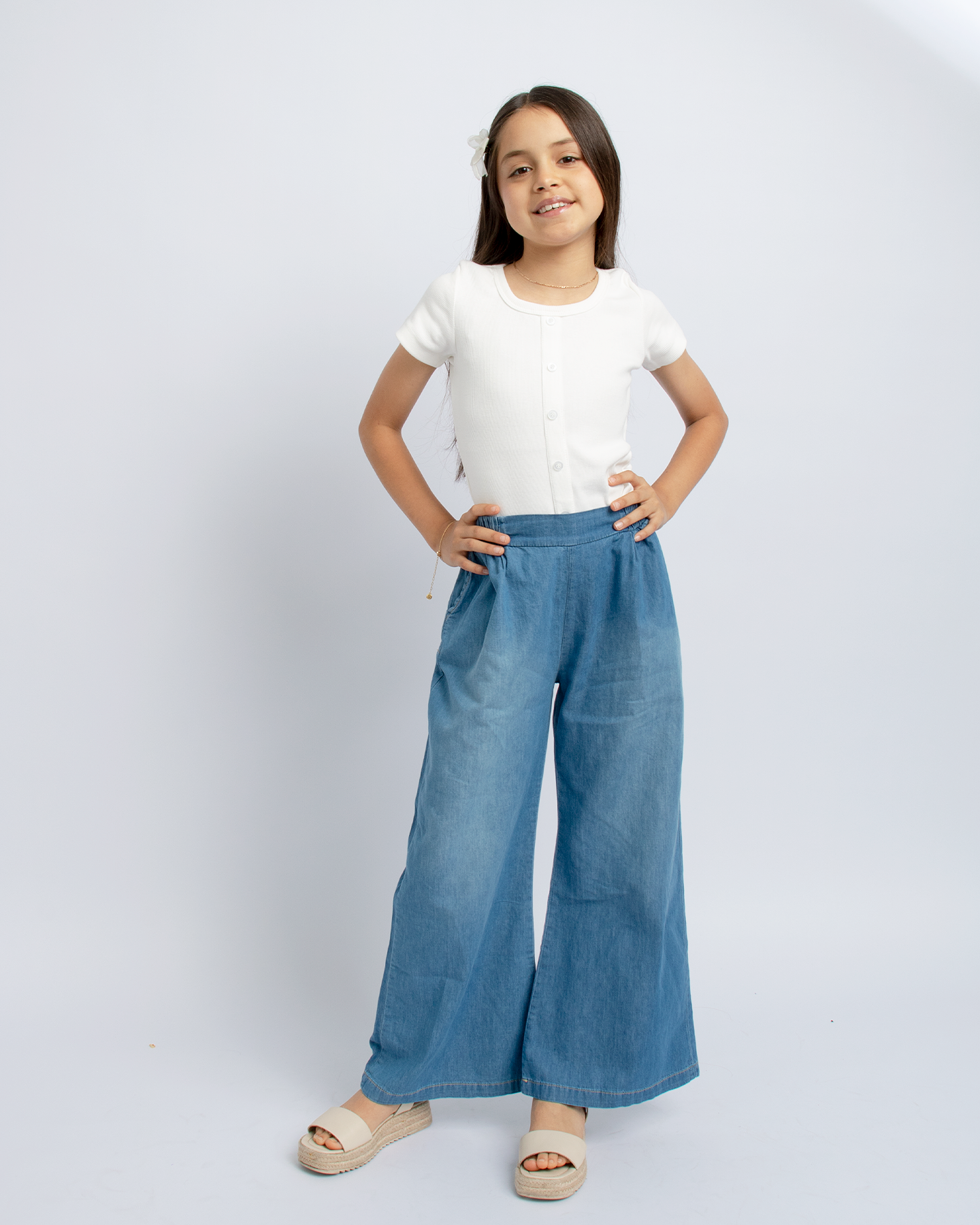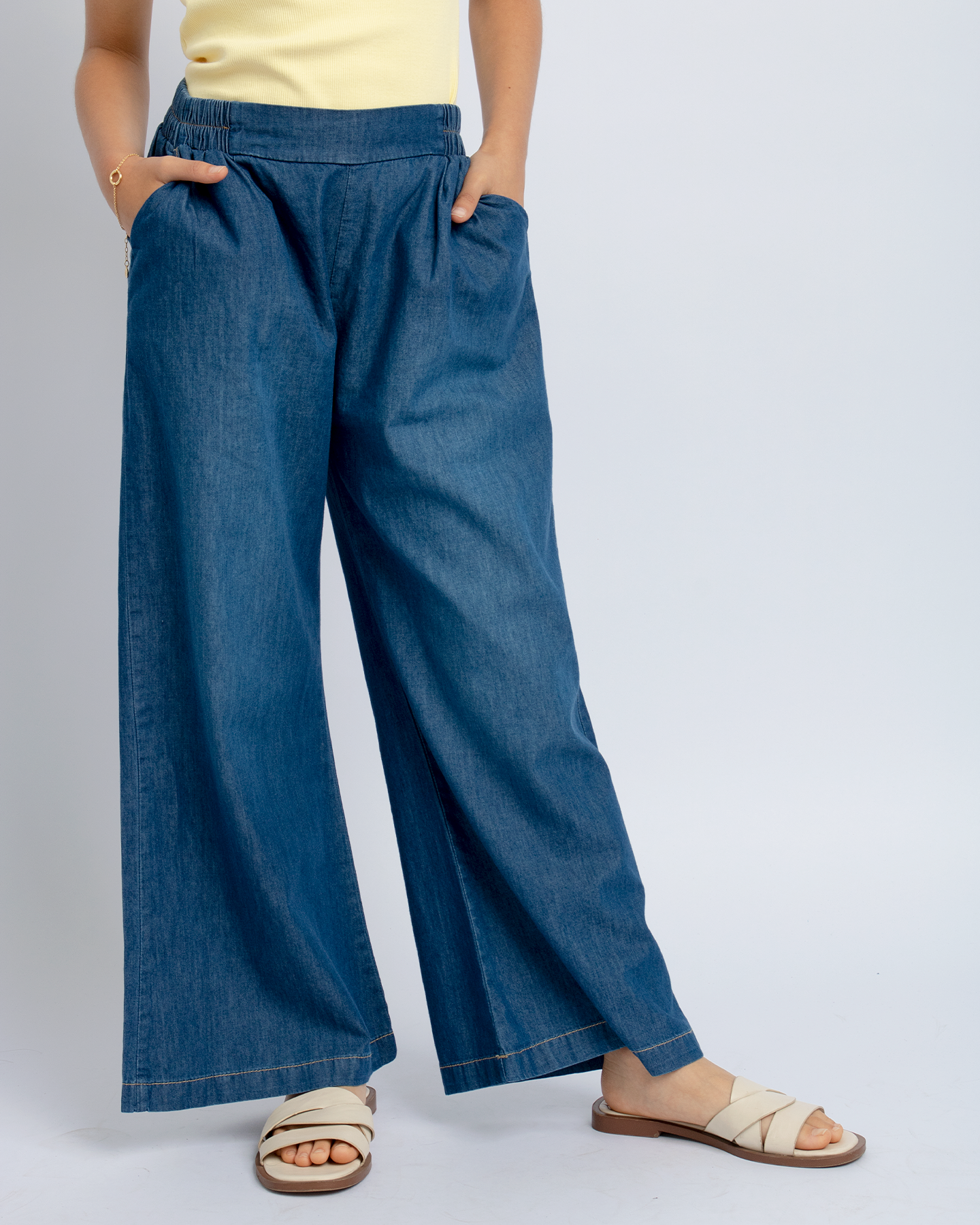 Nuestro Palazo Denim Marze es la elección perfecta para un look fresco y cómodo. Este pantalón palazo de denim cuenta con corrugado en la cintura, brindando estilo y confort.