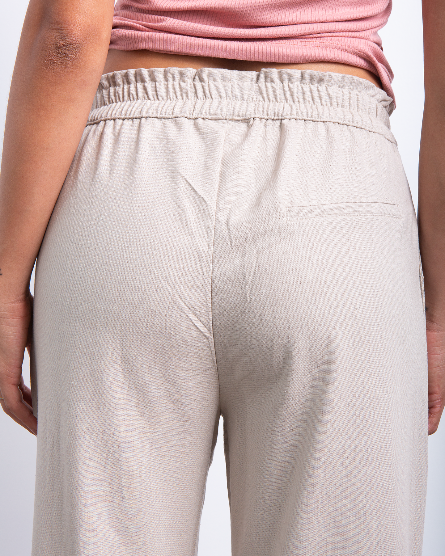 Este pantalón de lino en tono claro es esa prenda fresca y elegante que no puede faltar en tu clóset. De tiro medio y corte amplio, se adapta con suavidad al cuerpo y aporta un movimiento fluido que estiliza sin esfuerzo.