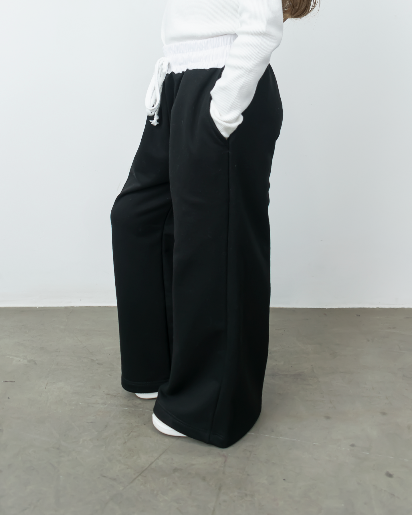 Pantalón de french terry estilo deportivo, corte ancho, pierna modelo sport.