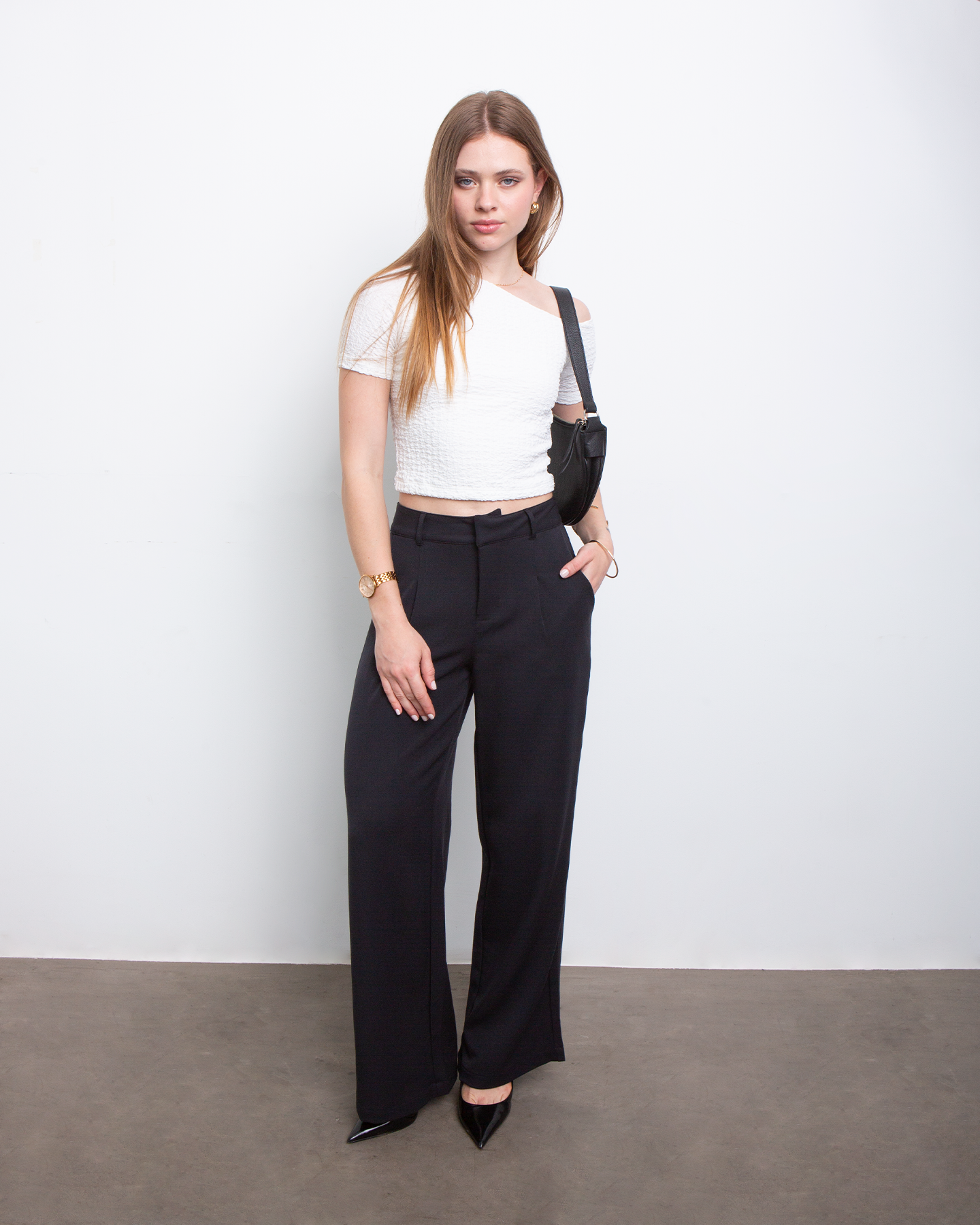 El pantalón “Any” tiene un corte sastre moderno que estiliza y alarga la silueta. Su tiro medio y piernas rectas hacen que se sienta cómodo pero elegante, ideal para looks de oficina, salidas o simplemente elevar tu día a día. Va perfecto con blusas, polos ajustados o tops más atrevidos.