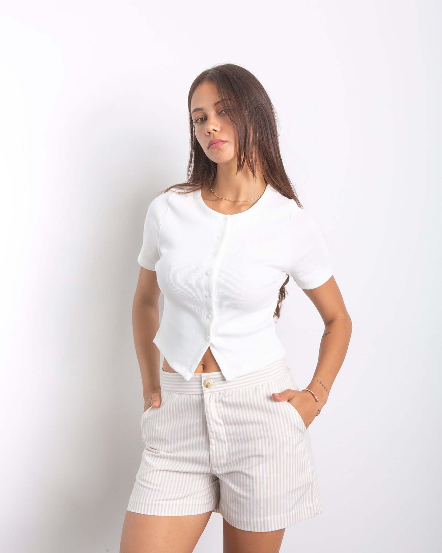 Minimalista, fresco y con un twist moderno. Este polo blanco tipo cardigan es esa prenda que transforma cualquier look con su corte favorecedor y su textura acanalada. El detalle del botón central que abre sutilmente en el ruedo le da un aire femenino y actual, perfecto para looks relajados con un toque de estilo.