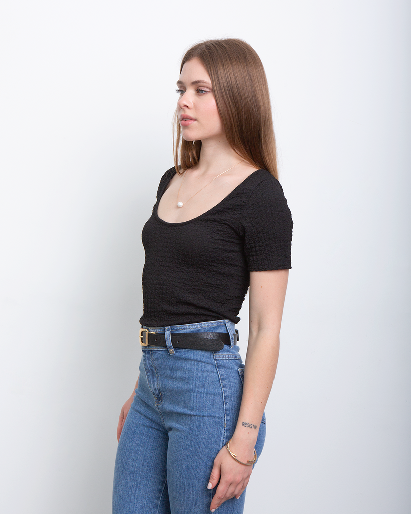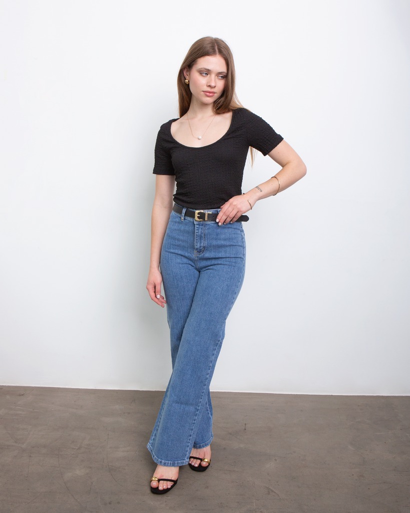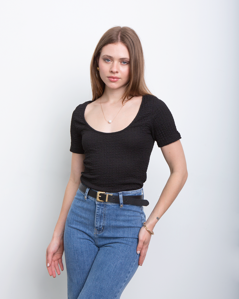 El top “Pía” es ese básico con encanto: tiene un fit al cuerpo que se adapta con suavidad y una textura tipo nido de abeja que le da un toque moderno. Perfecto para usar todos los días, ya sea con jeans, faldas o pantalones más formales.