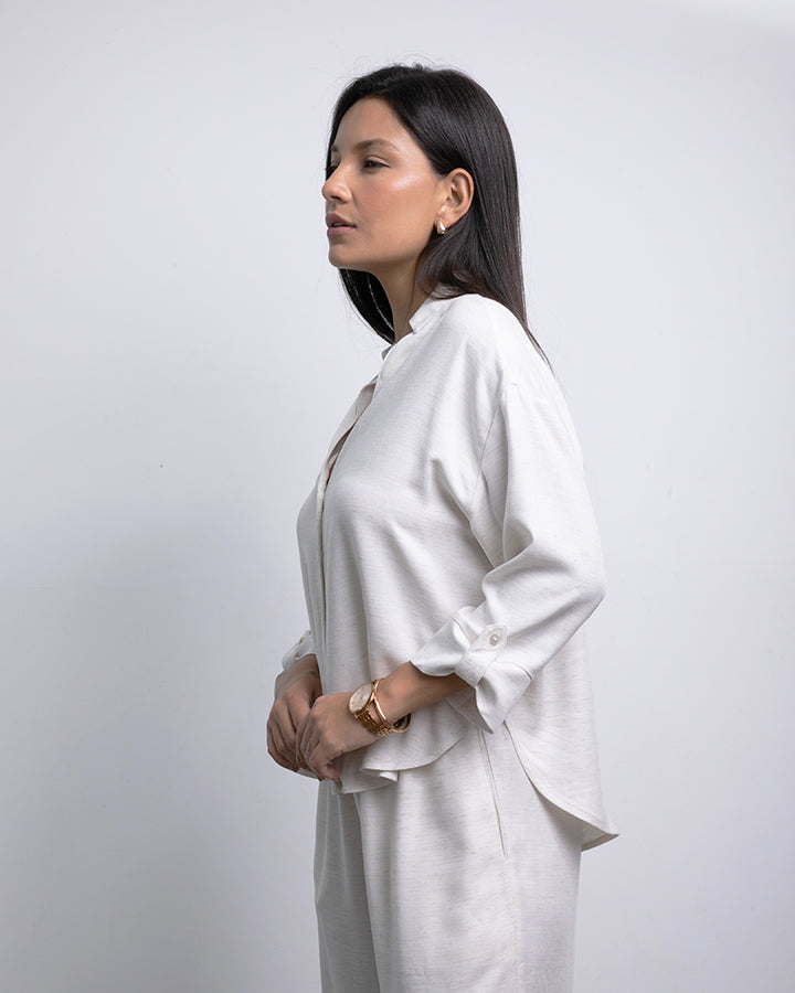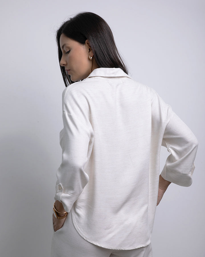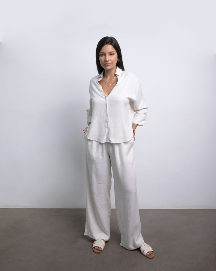 La camisa de corte amplio tiene cuello en V con solapa sutil, mangas 3/4 con botón y una caída suelta que favorece. El pantalón de pierna ancha, con pretina elástica y bolsillos, acompaña el movimiento con naturalidad. Perfecto para días de oficina relajados, brunch con amigas o escapadas de fin de semana.