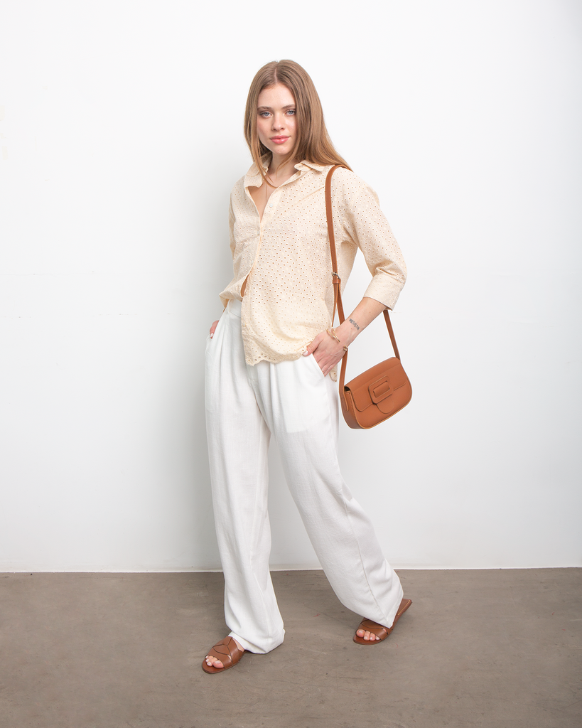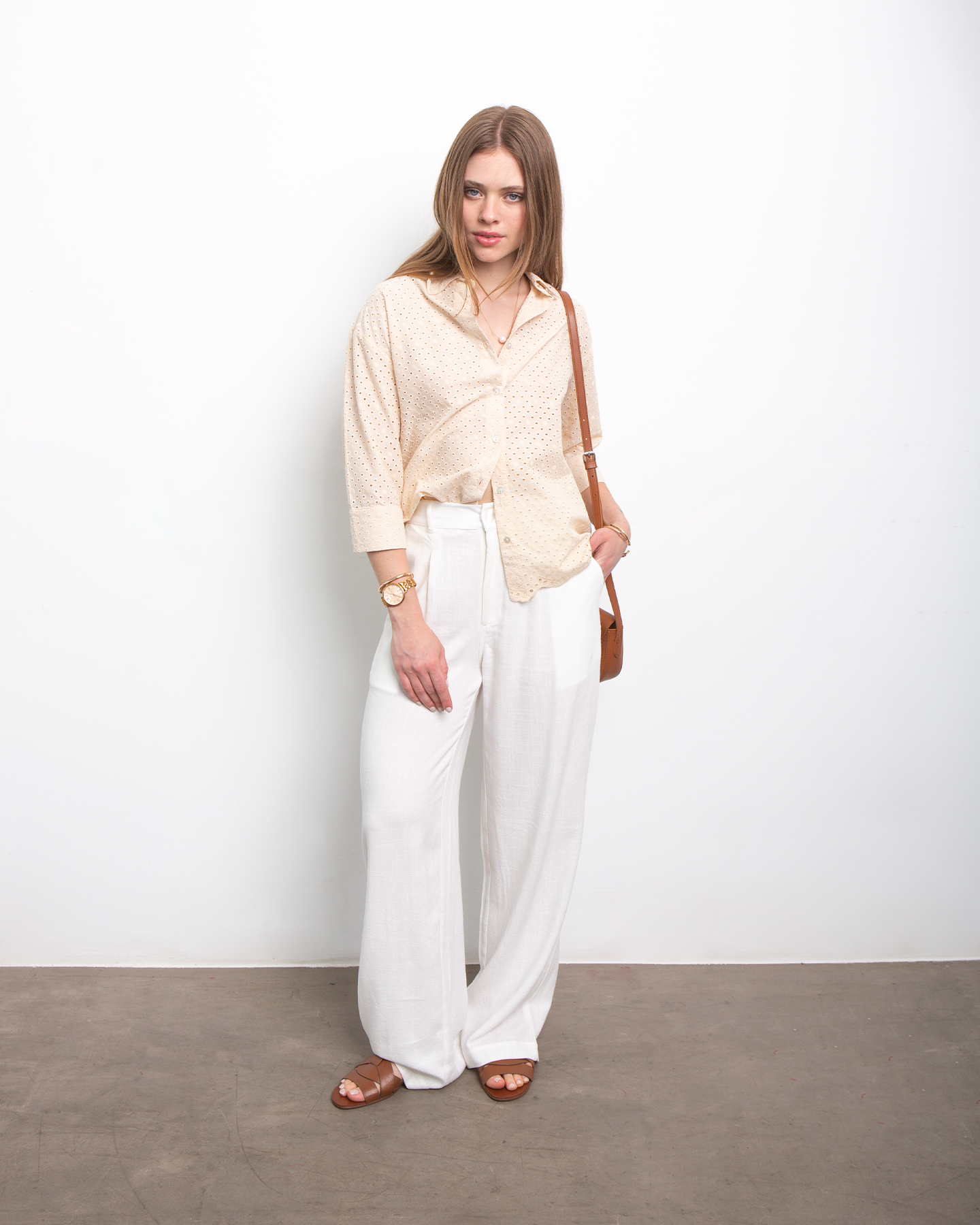 Este set combina la delicadeza de la camisa Ariel en broderie con la caída fluida del pantalón Lisa de lino. Una mezcla perfecta de textura, suavidad y estilo relajado para looks de día con un toque especial.