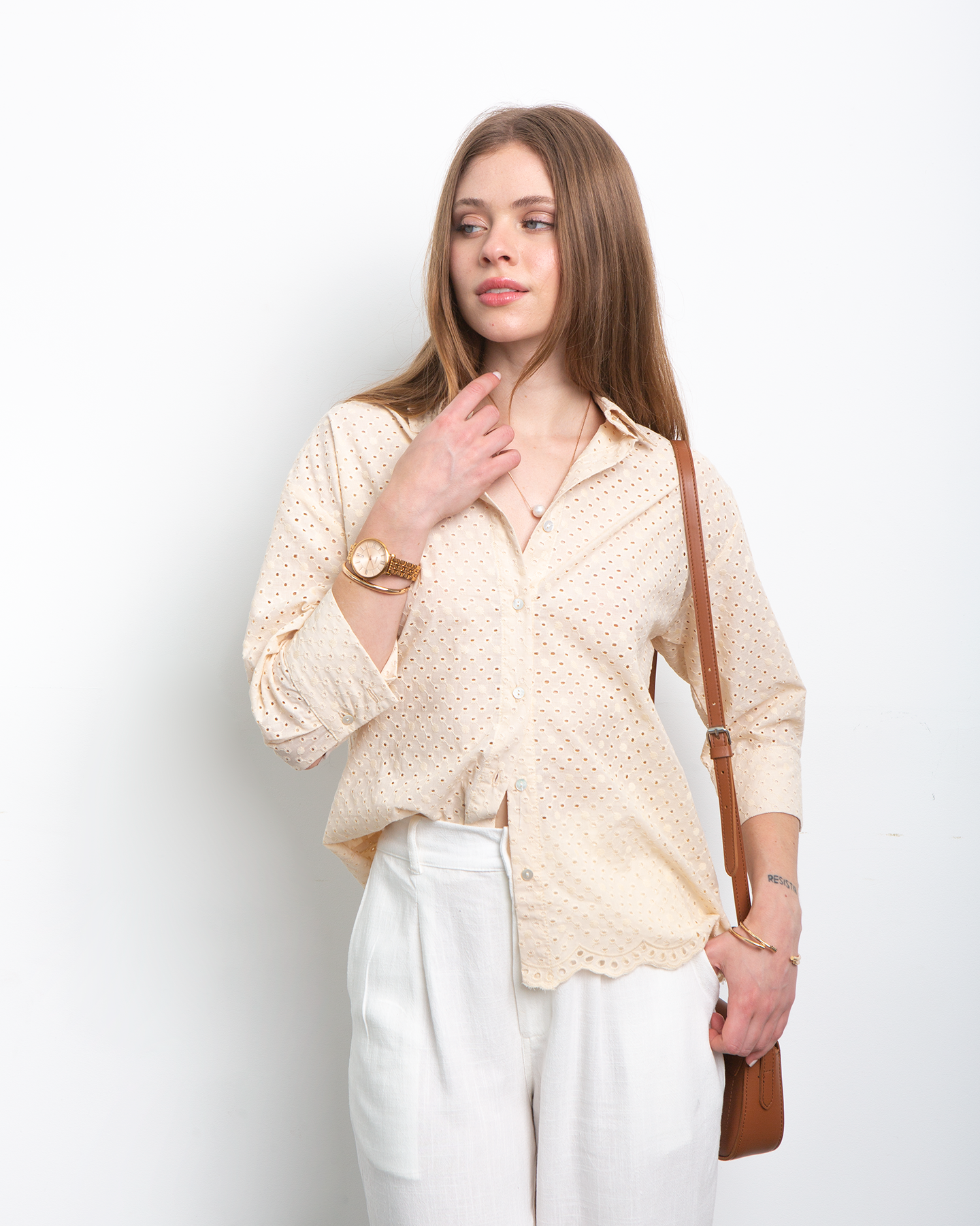• Camisa broderi 100% algodón, manga 3/4 y ruedo festoneado 🌿