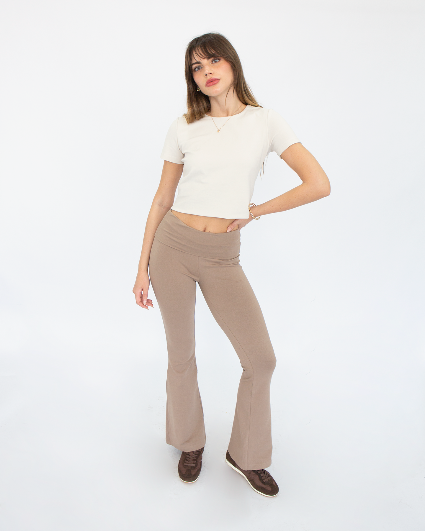 Este legging acampanado con pretina cruzada es ese básico con twist que eleva cualquier look casual. Se ajusta al cuerpo suavemente, realzando tu silueta sin apretar, y su tela licrada lo hace ideal para moverte con libertad todo el día.