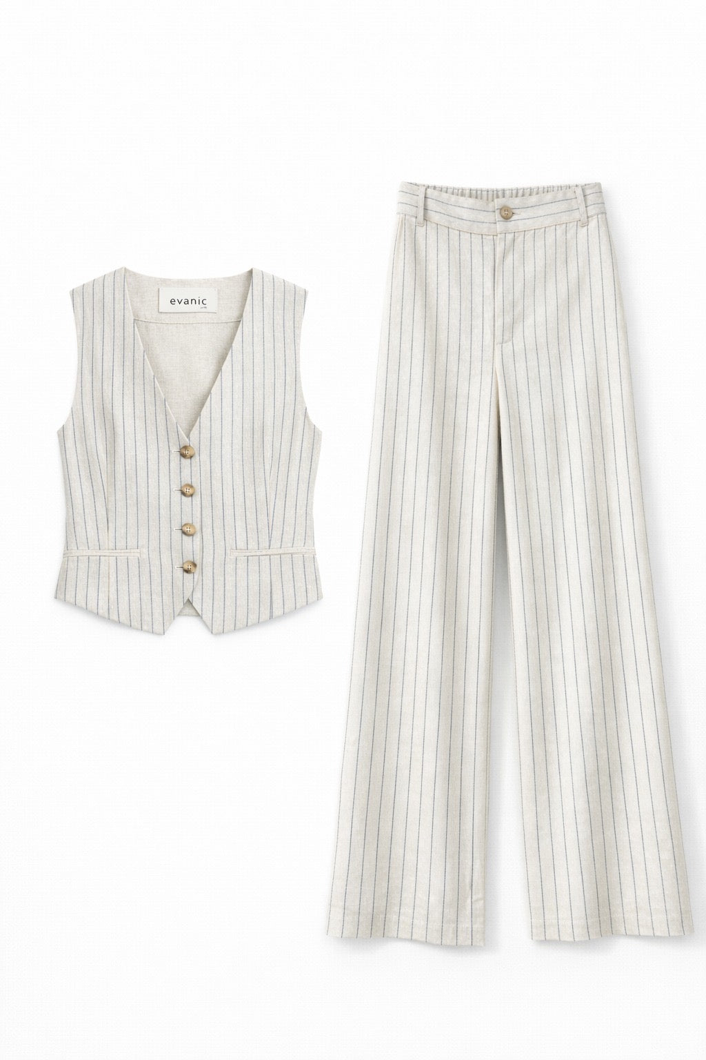El Set Lino Pia combina un chaleco escote V y un pantalón de pierna recta, ambos en lino rayado de textura liviana. Es un conjunto versátil que puedes usar junto o por separado, ideal para armar looks de verano con onda minimal. El chaleco tiene un fit estructurado que estiliza, mientras que el pantalón aporta comodidad sin perder elegancia. Perfecto para días de oficina, brunch de domingo o escapadas urbanas.