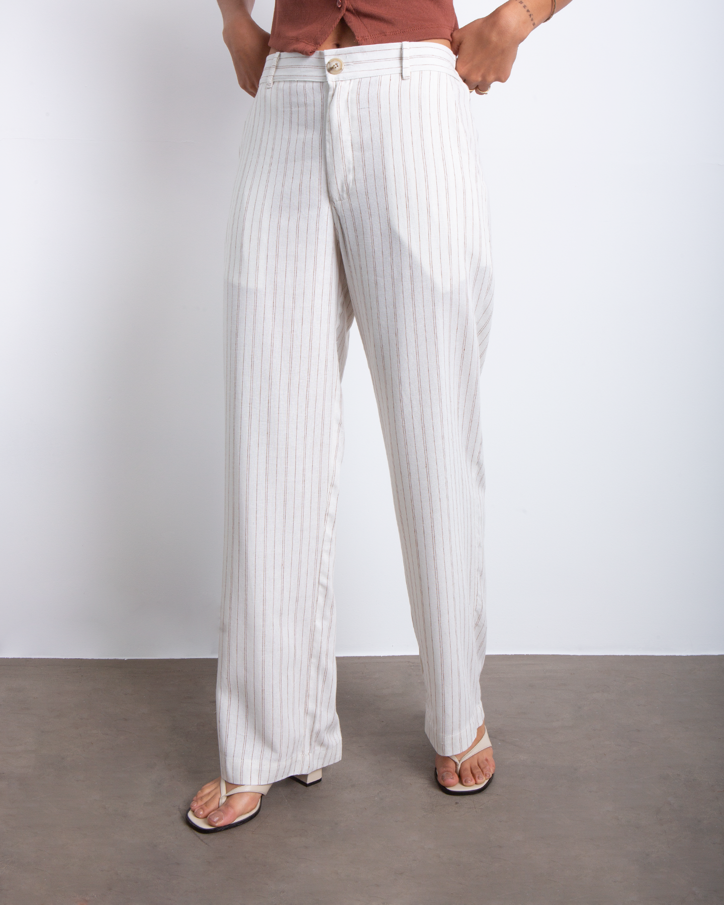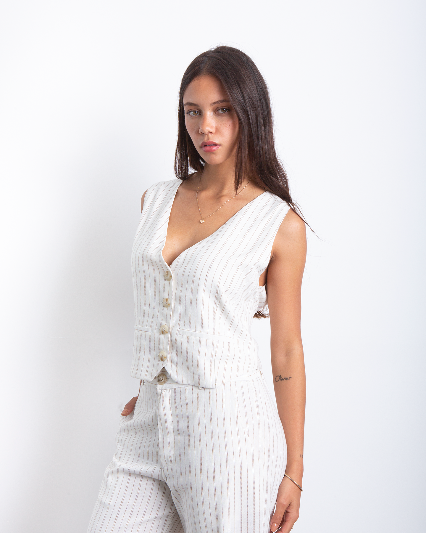 El Set Lino Pia combina un chaleco escote V y un pantalón de pierna recta, ambos en lino rayado de textura liviana. Es un conjunto versátil que puedes usar junto o por separado, ideal para armar looks de verano con onda minimal. El chaleco tiene un fit estructurado que estiliza, mientras que el pantalón aporta comodidad sin perder elegancia. Perfecto para días de oficina, brunch de domingo o escapadas urbanas.
