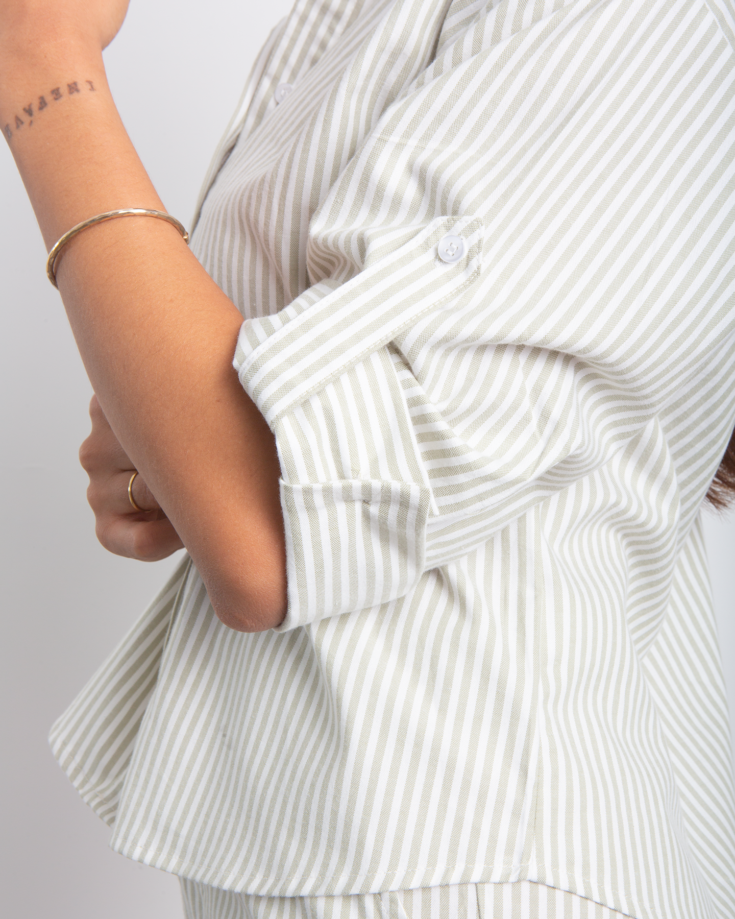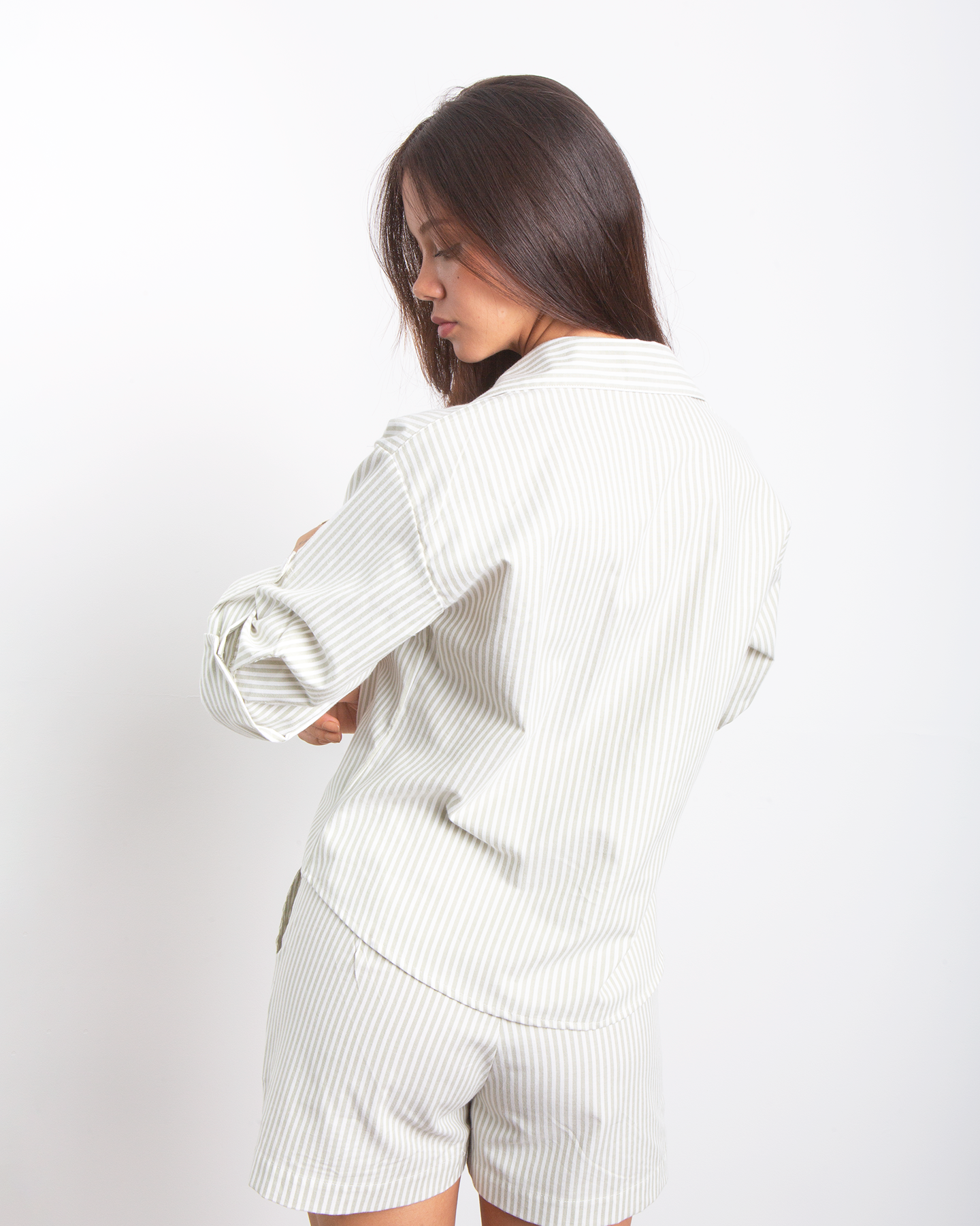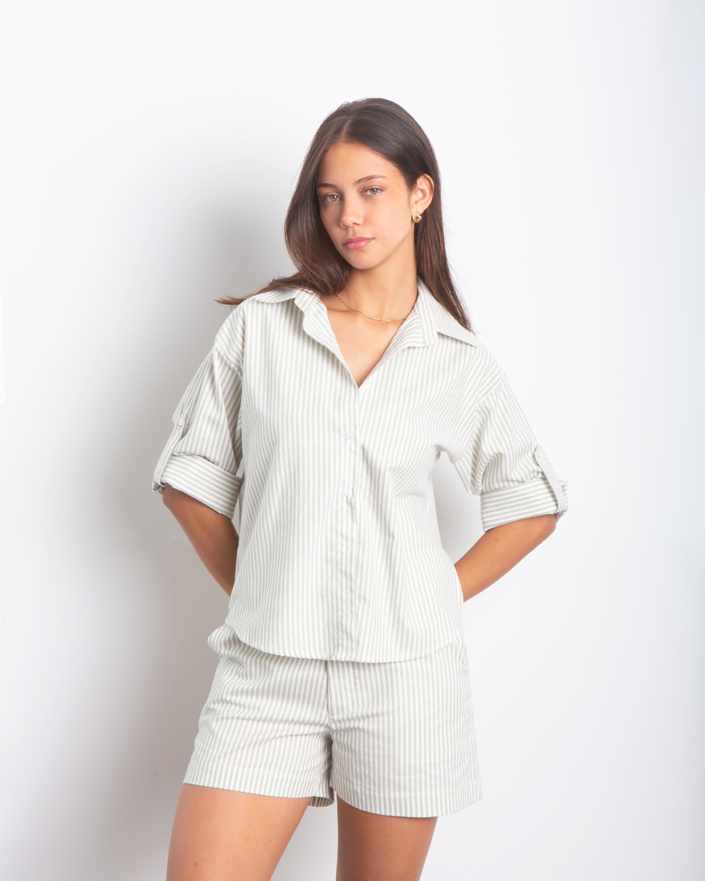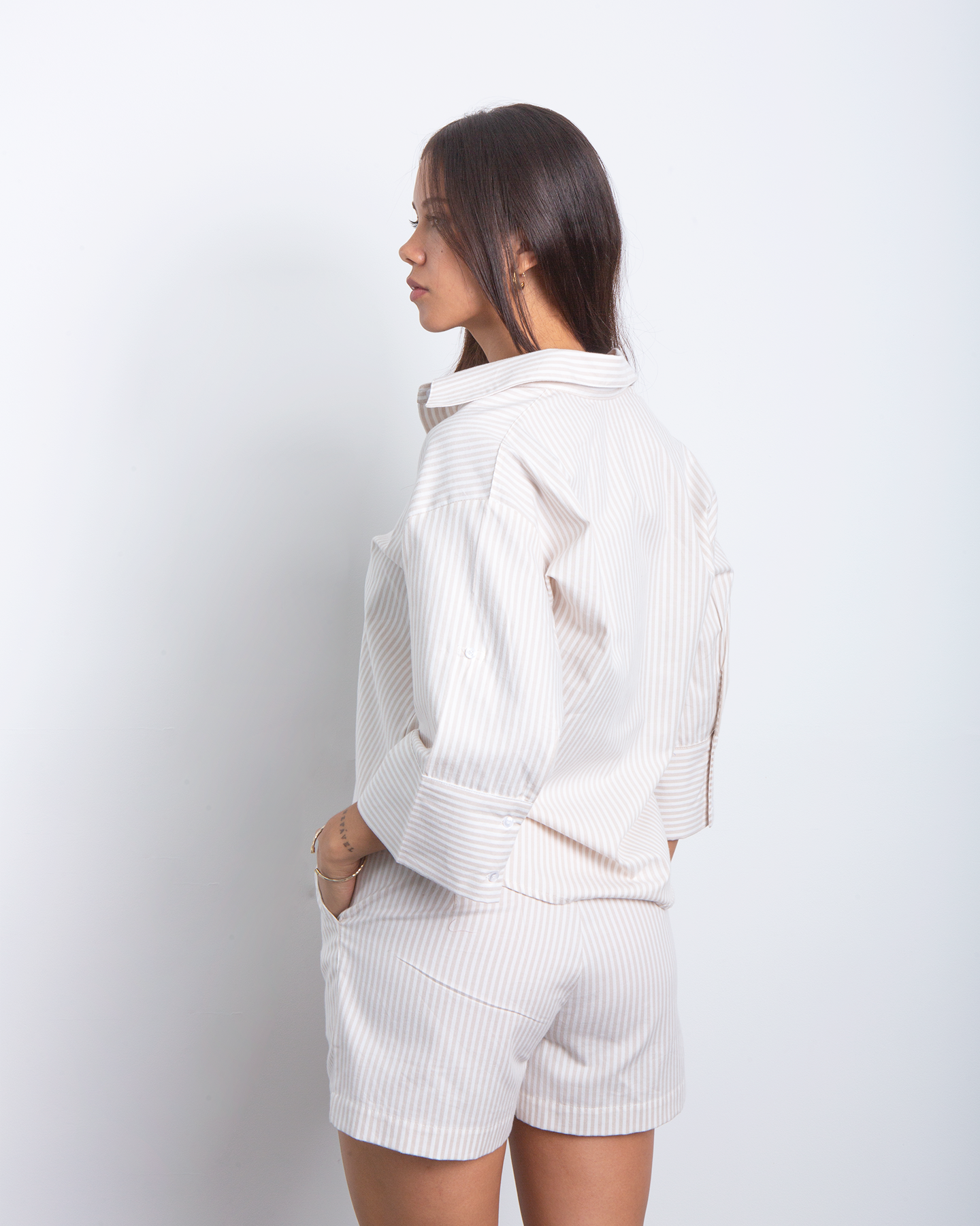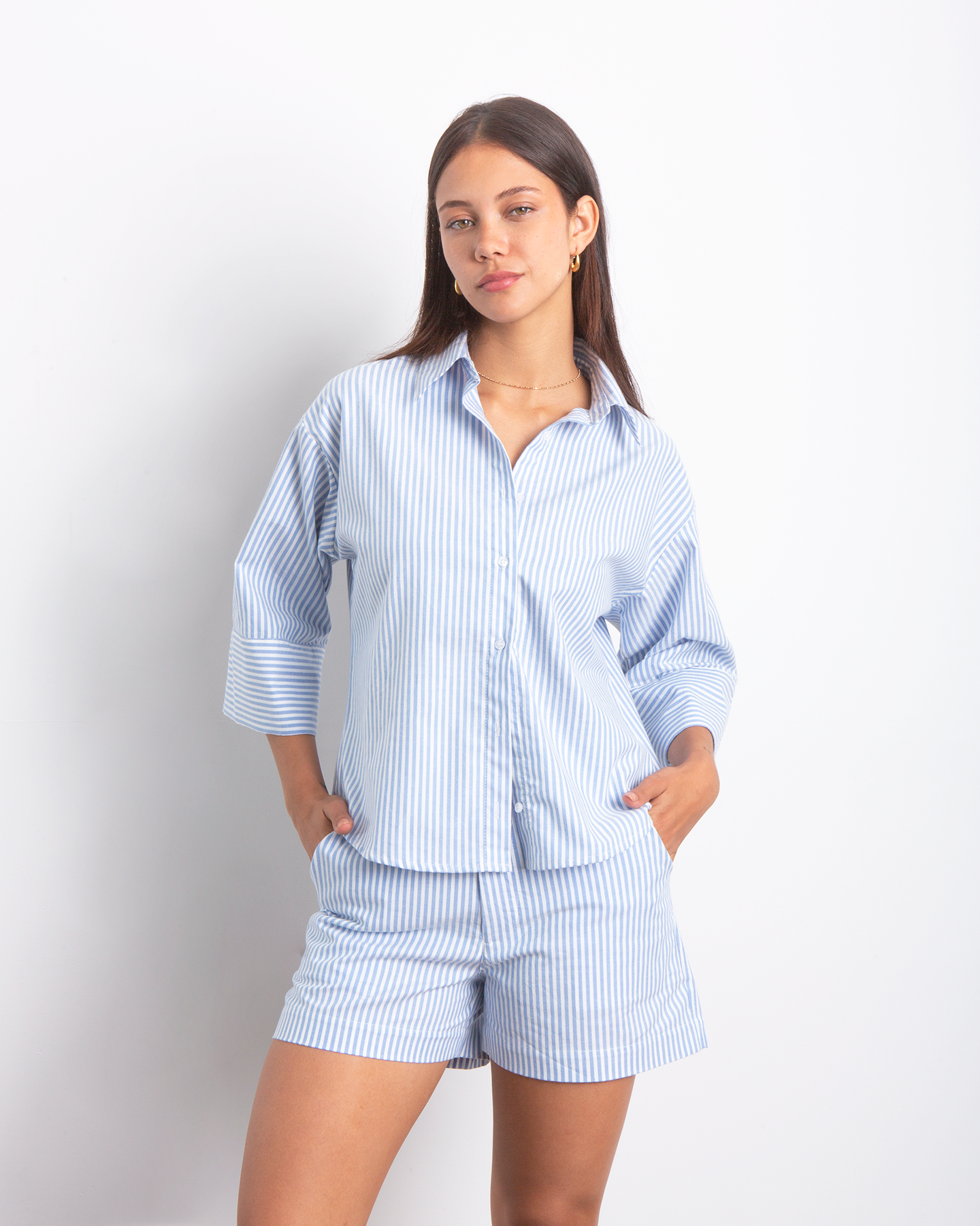 Este set a rayas de camisa y short es la definición de versatilidad chic. Su tela liviana mezcla rayón y algodón, logrando una textura suave con buena caída, ideal para climas cálidos. La camisa tiene un corte relajado tipo oversize, mientras que el short aporta estructura y comodidad. Úsalo junto para un look coordinado o por separado con básicos neutros.