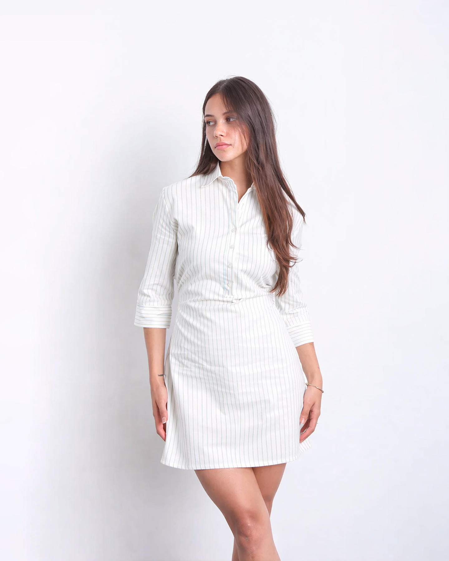 Un clásico fresco con actitud relajada. Este vestido camisero de rayas celestes tiene ese equilibrio ideal entre lo pulido y lo relajado. Su diseño recto estiliza sin ajustar y la manga 3/4 con puño amplio le da un aire moderno y versátil.