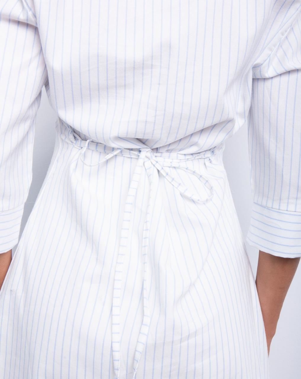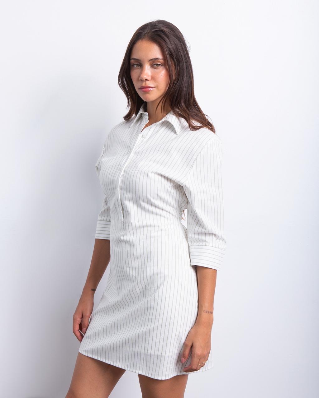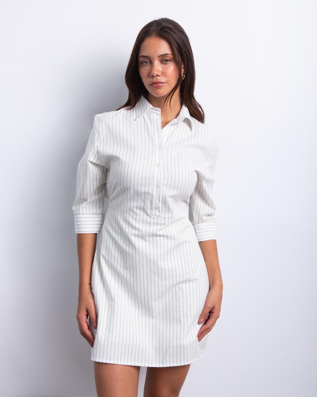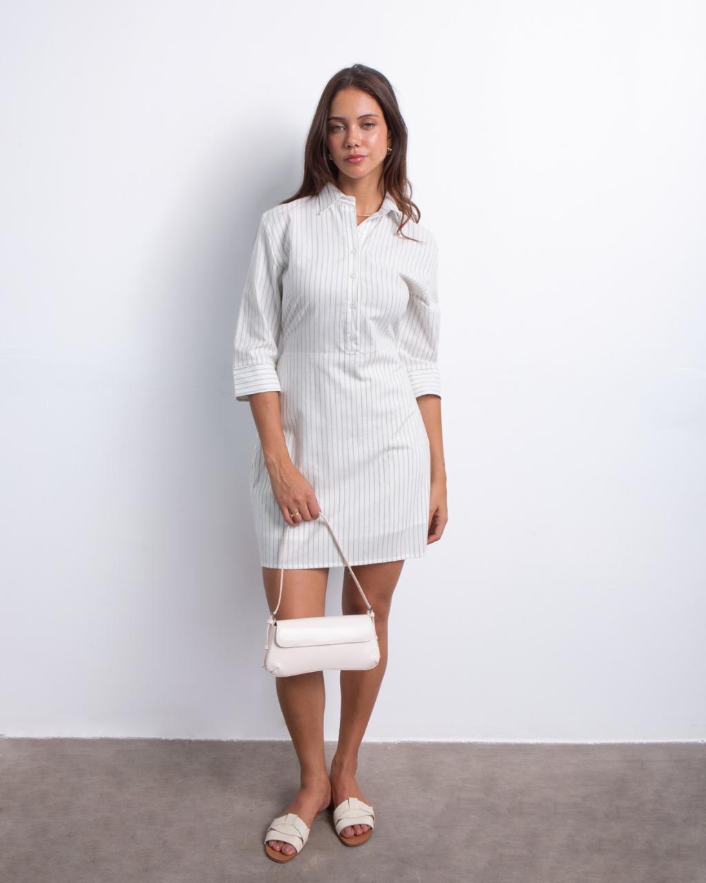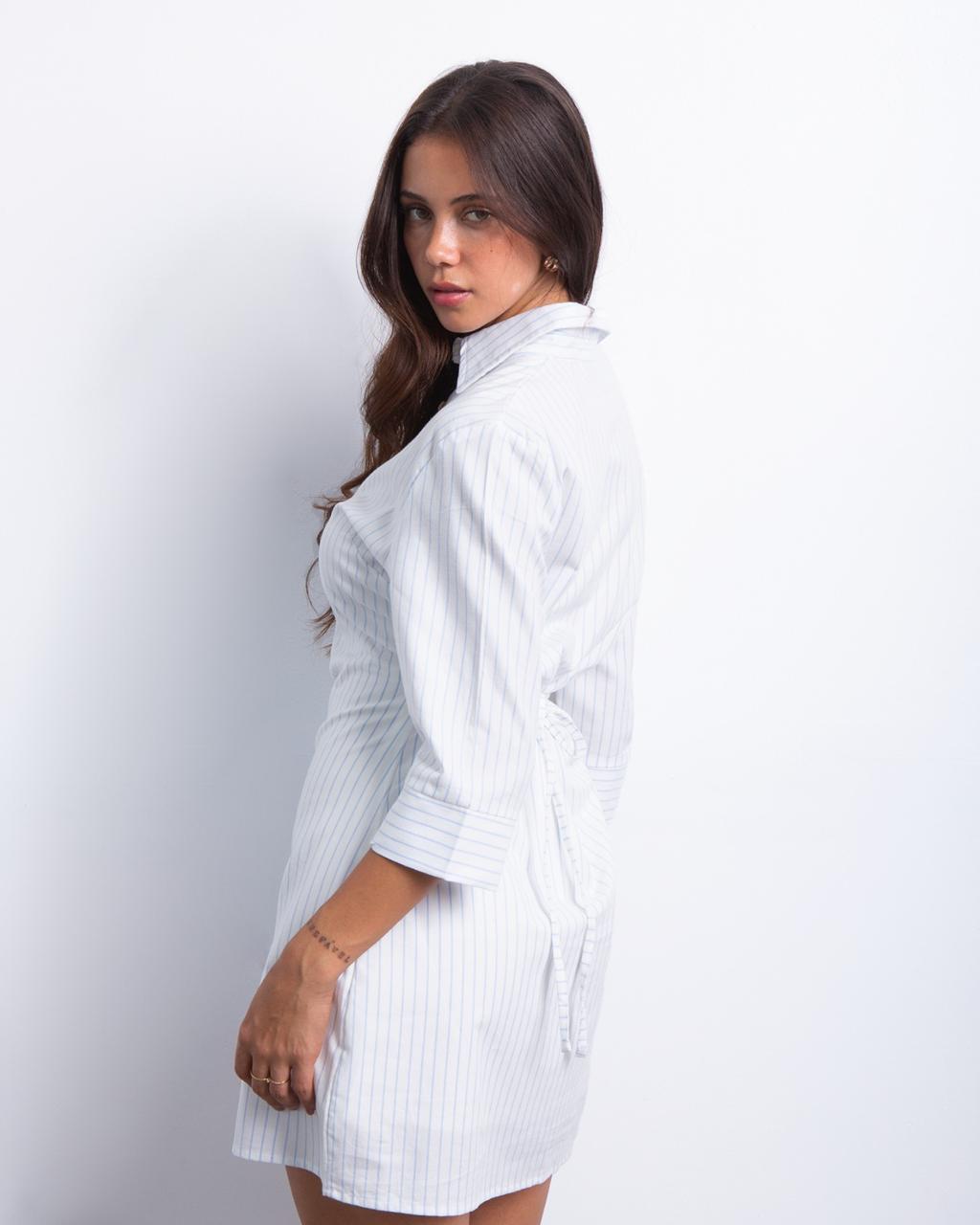 Un clásico fresco con actitud relajada. Este vestido camisero de rayas celestes tiene ese equilibrio ideal entre lo pulido y lo relajado. Su diseño recto estiliza sin ajustar y la manga 3/4 con puño amplio le da un aire moderno y versátil.